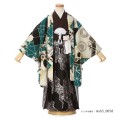 男性の第一礼装の紋付袴でも黒色が使用されることから、やはり格調の高さ、重厚感を感じます。普段着用することがない伝統的で正統派な装いは、人生の大切な節目に相応しいので非常におすすめです。白色の羽織に、「孔雀緑(くじゃくみどり)」と呼ばれる、孔雀の美しい青緑の羽のような伝統色が使用され、美しい色使いが目を惹きつけます。文様も古典的なものばかりで、「兜」は、身体の中でも重要な頭を守るための道具とされ、邪気や災いから守ります。また地位が高い武士のみ着用が許されたことから出世、大成の象徴とされてきました。「刀」も、厄除けの役割として描かれます。そして力強く美しい「鷹」。遠くまで見渡すことが出来る鷹の目には、本質を見抜く、先を見通すという意味と、鋭い爪は獲物を掴み離さないということから、掴んだ幸運を離さないという意味が込められます。そして袴には「亀甲」が華やかに描かれます。「鶴は千年、亀は万年」と言われるように、長寿の象徴とされてきました。縁起のいい吉祥文様が沢山描かれ、お祝いの想いが込められた晴れ着は、特別な日にぴったりでしょう。
