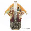 オレンジから臙脂へのグラデーションがおしゃれなこちらのお着物には、力強さを感じさせる「龍」・「武将の道具」が描かれています。縁起物「松」も全体を華やかに仕上げてくれて、お祝いの喜びが全面に溢れたお着物です!七五三のお着物には「龍」や「兜」が描かれていることが多いのはご存知でしょうか?なぜ?と思われる方も多いと思いますが、その2つには「強さ」「出世・飛躍」の意味が込められているんです。そのため、古くより日本ではこれらの文様を着物にあしらい、男の子の健やかな健康と将来の活躍を祈っていました。「龍」は神獣と信じられ、ギョロッとした力強い瞳と瞳天を泳ぐ姿がたくましく、人生の飛躍を感じさせることから男の子を象徴する柄として親しまれてきました。「兜」は武士の象徴であることに加え、災や疫病から男の子を守る厄除けのような存在。どちらも元気な成長を願う際には、なくてはならない文様でした。こちらのお着物には、それ以外にも武士を思わせる軍配や槍が描かれています。古典的な文様は意味を知るとまた見方が変わってきますよね。お子さんの健やかでたくましい成長を願って、選んでみてはいかがでしょうか。