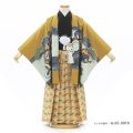 こちらのセットは明るいカラーの羽織と袴が気分まで明るくさせてくれるようです。明るいベージュ系の色をベースにした袴は、落ち着いたグリーンとブラウンで作られた三角形の模様がアクセント。華やかで品のあるデザインに仕上げられています。男の子の羽織は黒系かブルー系の物が多いですが、こちらは明るい黄土色がベースカラーになっているのが特徴です。そして、背中には大きく立派な船が、波しぶきをあげながら大海原を渡っていく様子が描いています。この船は宝船といって、おめでたい柄のひとつですが、その名前の通り、宝物をたくさんのせています。振ると望みの物がでてくるという打ち出の小槌(こづち)や松や梅が溢れんばかりに描いています。帆にも円が重なって繋がっている七宝柄や六角形をした亀甲柄など、おめでたい柄がたくさん。一番大きな帆には寳(たから)の文字も刺繍されていて、とても豪華なデザインです。宝船の右下の円の中には戦国武将が身につけていたような兜も描かれていて、かっこいいですね。ひととはちょっとちがったテイストで豪華にかっこよくキメたい方にもおすすめのコーディネートです。