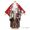 人気ブランド“式部浪漫”より、ダイナミックさと優雅さを兼ね備えた羽織袴の登場です。目にも鮮やかで美しい赤い羽織には、男の子の大成を願う鷹・龍・兜が勇ましく描かれています。特に目を惹くのは背中に配した大鷹。力強い爪と大きく広げた翼、そして獲物を射るような眼を持った大鷹は、幸運をつかんだら離さない強運と、高く高く昇っていく出世運を持ち合わせた文様です。散りばめられた丸紋の中には、矢羽や梅などの縁起の良い柄が描かれています。背景に位置した大波や波頭は、何度でも押し寄せる強さから、我が子に不屈の精神を持ってほしいという願いが込められています。また雅な有職文様である花菱や花七宝紋の連続文様が波のように彩っており、大胆な波頭と有職文様のコントラストが目を楽しませてくれる羽織といえるでしょう。袴の地色は羽織を引き立たせるように、グレーから海老茶色へと移り変わるグラデーションとなっています。地紋はこちらも優美な花菱紋が施され、羽織袴全体を格調高く表現しています。5歳の男の子の七五三は初めて袴を身に付ける袴着の儀。強く美しい伝統文様が織りなす羽織袴を着たお子様に、お祝いに駆けつけたおじいちゃん・おばあちゃんもきっと喜びますよ。