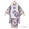 遠目にはグレーに見える地の上に淡い色で桜を描いた着物と、濃淡の紫色で桜を描いた被布が、いずれもしっとりした雰囲気を醸し出す装いです。着物の地の部分は、ごく細い紺と白の縦縞。遠目にみると穏やかなグレーに見える縦縞です。その上に描かれたのは、桜の花でできた花の丸。このように花々で丸い形を構成したものを花の丸といい、若いお嬢様の着物では人気の文様です。こちらの花の丸は、桜の花のみで描かれているため、控えめな印象になりますね。桜に使われたピンクが落ち着いたトーンであることも、清楚な雰囲気に繋がっています。そんな少し大人しめの雰囲気もあるこちらの着物ですが、決して地味な印象にならないのは、大小の花の丸が散らされてデザイン全体に動きが感じられるからでしょうか。被布には、同じく桜による花の丸文様のものを合わせました。真っ白な被布は、お嬢様の清らかな可愛らしさを引き出してくれます。桜が濃淡の紫で描かれていること、刺繍もほどこされていることから、着姿に奥ゆきが感じられますね。桜の花の着物というと、季節を気にされる方が時折いらっしゃいますが、こちらの桜は抽象化されたデザインのため、季節を問わずお召しいただけます。記憶も写真もずっと残るから、いつまでも良さが変わらない、雰囲気の良い装いを選びたい、そんな親御さんにお薦めの装いです。