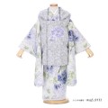 清楚さと華やかさが同居し、洋服感覚で着こなせそうな、着物と被布がお揃いのコーディネートです。すっきりとした白地の上に、様々な洋花が描かれた着物です。昔ながらの着物が花の種類がよく分かるデザインを好むのとは異なり、特定の花を思わせないデザイン化された花模様が、現代的でお洒落な雰囲気を漂わせます。大中小と異なる花のサイズのバランス、それらの花々の配置のバランス、同系色の濃淡でまとめられた色遣い、これらが全て合わさることで、完成度の高いデザインとなっています。被布は、寒色系でまとめられた着物の雰囲気を大切に、薄グレー地のものを合わせました。薄グレーは、すっきりと雰囲気もありながらも、クールになりすぎない不思議な色。この色のお蔭で、ともすれば3歳のお嬢様と大人っぽい着物の色柄がアンバランスとなってしまいそうなところを、うまくバランスをとってくれています。丸く大きく作られた襟も、幼い年頃にこそ似合う可愛らしいデザインですね。いかにも着物らしい色柄ではないものの方がお好みかもしれない、そんなお嬢様にお薦めの装いです。