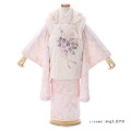 着物地の草花は抽象的なもので、特定のものではありませんが、全体に繊細に描かれており非常に華やかな印象です。季節問わずに着ていただけるのもおすすめポイント。被布には、花束の文様が描かれていますので、おめでたいお祝いのシーンにぴったりです。色使いも女の子着物らしく、ふわっと優しいカラーが使用されています。着物の薄ピンクは名前も可愛い「桜色(さくらいろ)」。その名の通り、桜の花弁にイメージされる赤みを含んだ淡い紅色です。紅染の中で、もっとも淡い色で、ほんのり赤みをおびた女性の頬を例える際にも使用される色味です。被布の色は「生成色(きなりいろ)」が使用されています。晒す前の木綿のような黄みの白色で、馴染みのよいナチュラルカラーです。淡いカラーは見ている人を優しく幸せな気持ちにしてくれます。どなたにも好感度が高い上品で優美な装いは、大切なシーンにぴったりです。