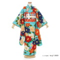 浅瀬が続く海の色のような美しいブルーグリーンがぱっと目に入ってくる印象的なお着物です。大輪のつばきがところ狭しとデザインされていて、華やかです。ポピュラーな赤や白に加え、実際にはない青や紫など、さまざまな色のつばきが描かれていますが、この配色の妙が地のブルーグリーンの色とつばきとを両方とも引き立たせています。中央の裾の近くには、後ろを振り返るようなしぐさをしている小鳥が描かれています。小鳥の頭からお腹にかけてのピンクに描かれたところが、とてもすてきなアクセントに。このお着物の素材は高級化繊ですが、この発色の豊かさ、鮮やかさは高級化繊ならではのもの。帯にもお着物の色味に合うように赤や黄色などさまざまな色のストライプがデザインされています。はこせこには、さくらなどの花の刺繍が施され、胸元に豪華さを添えています。