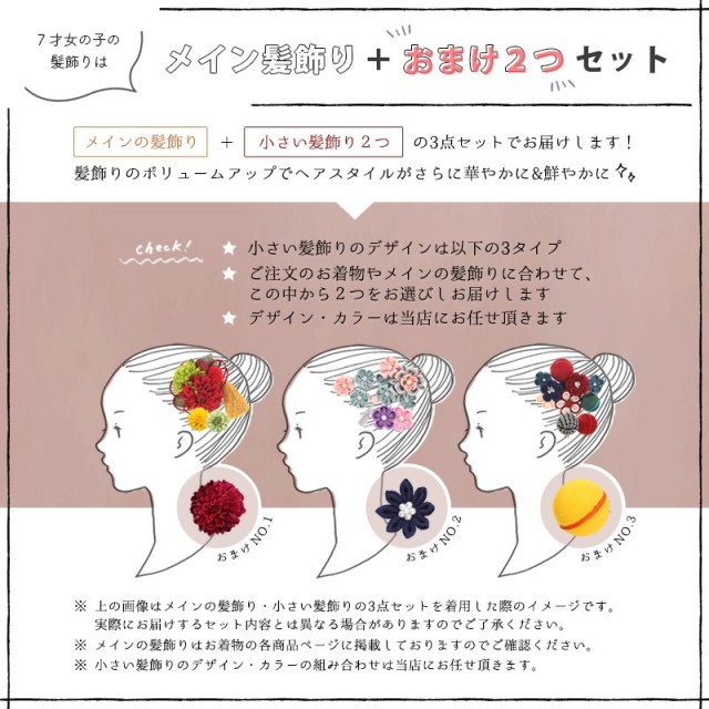 | コーディネート | 女の子七五三(7歳女の子用)に含まれる物:着物、長襦袢(カット袖)、作り帯、草履、バッグ、帯揚げ、箱迫、帯締め、しごき、末広(扇子)、足袋、腰紐(2本)、コーリンベルト、伊達締め、髪飾り |