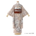 おしゃれなくすみカラーで落ち着きのある可愛さがこちらの着物の魅力です。着物地の色は「桜鼠(さくらねずみ)」と呼ばれ、淡い紅色が灰色あるいは薄墨がかって、わずかにくすんだ薄い桜色のことです。いわゆる墨染の桜の色味が使用されています。色名に鼠が付く色は、江戸時代初期頃から見られる非常に古くから伝わる伝統色です。そして文様は大輪の花が美しい「牡丹」。牡丹はたくさんの花弁があり「百花の王」と呼ばれています。富貴、高貴、幸福を表しています。統一感のあるコーディネートは、洗練されたセンスの良さを感じます。色味や文様は古くから伝わる古典のものですが、描き方は西洋の絵画のようなデザインで上手く和と洋が融合されています。気品のある装いでいつもとは違った大人っぽい立ち姿を見ると、大きな成長を感じていただけることでしょう。