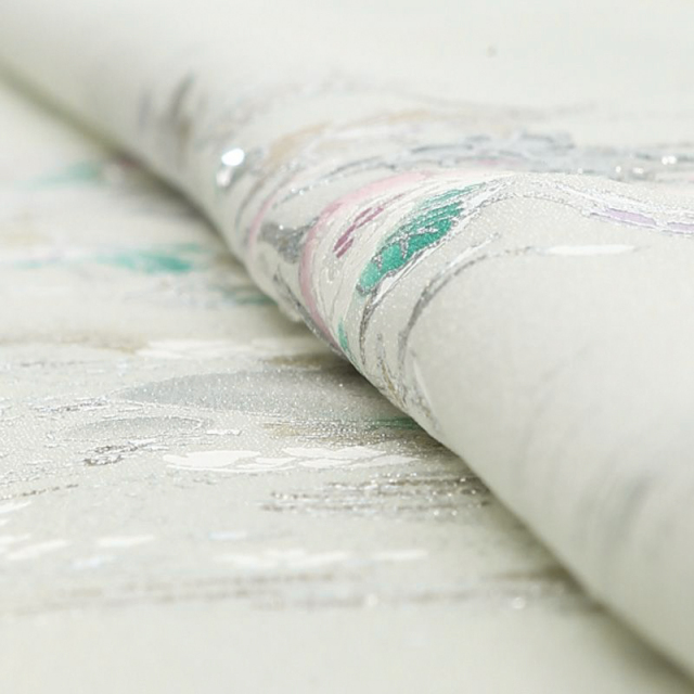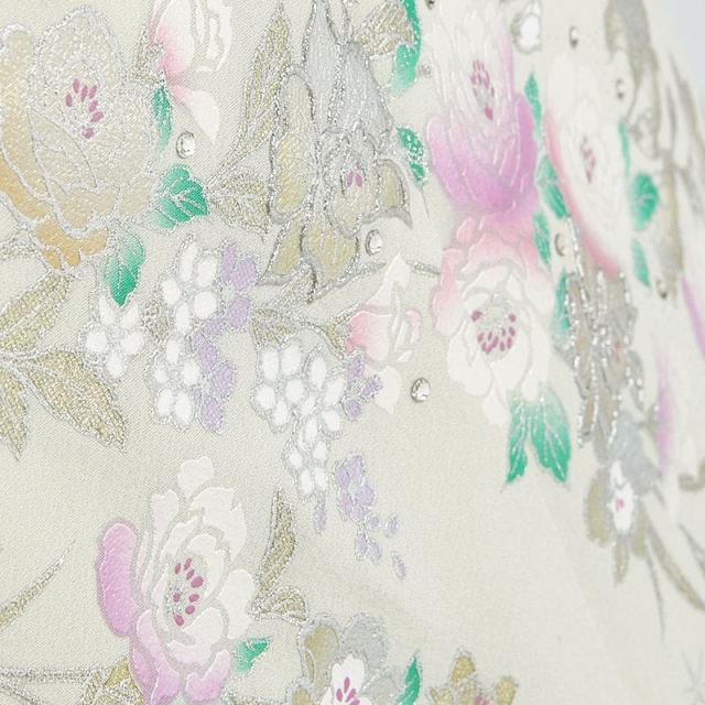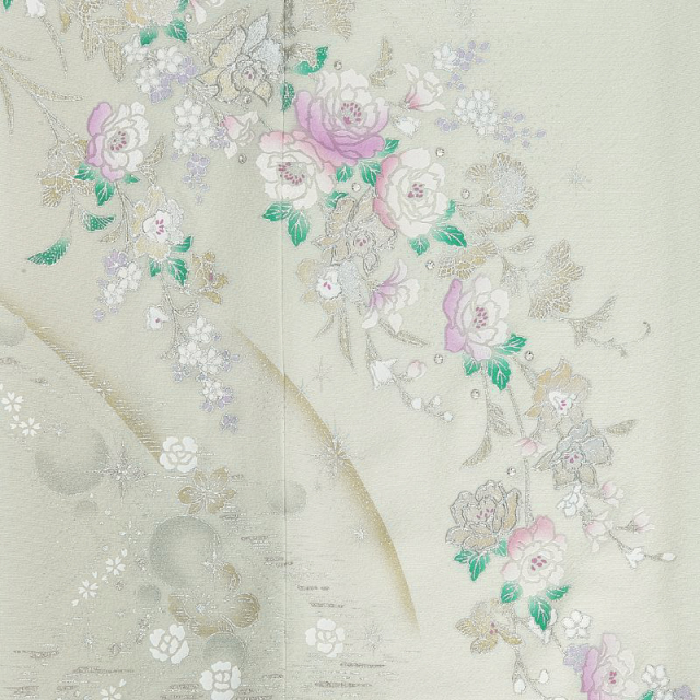 長年、女性の憧れのウエディングドレスを世に送り出してきた桂由美。着物のデザインに於いても桂由美らしいエレガントで女性らしい世界観を表現し続けている大人気ブランドです。こちらの付け下げも爽やかなライトグリーンの地色に、金銀の彩色を施した薔薇がキラキラと輝いて気品溢れる仕上がりとなっています。「薔薇」は外国から伝来した洋花で、着物の古典文様の長い歴史と比較するとモダンな存在です。ですが、「薔薇」の花言葉が愛情であることと、その華やかな存在感で近年は着物の柄として大人気なんです。白薔薇の花びらに施されるピンクのグラデーションと葉の緑が、シックな地色とのコントラストにもなり、薔薇全体を立体的に見せてくれています。文様全体に使われる金彩と銀彩はギラギラとした色味ではなく、豪華でありながら上品な仕上がりになっています。また、着物では珍しい、ラインストーンが使われているところも桂由美らしいモダンテイストの融合です!薔薇の周りにラインストーンを配置することで、薔薇が輝いて見えるデザインになっています。古典のシックさと洋花のモダンさを融合させた気品溢れる1着です。