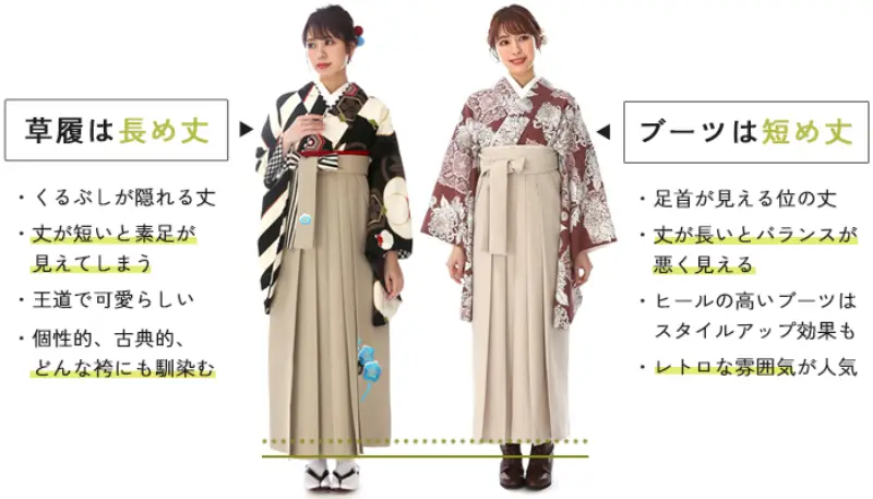 卒業式の袴選びでは、履物によって選ぶ袴の長さが変わります。