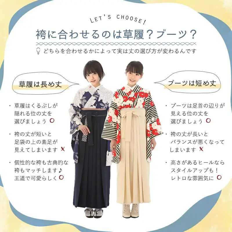 卒業式の袴選びでは、履物によって選ぶ袴の長さが変わります。