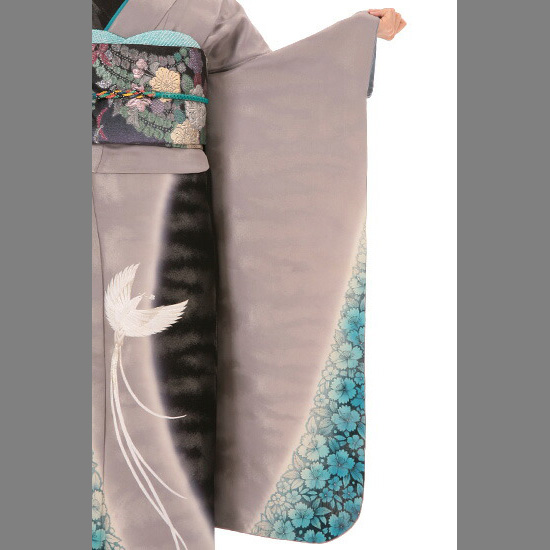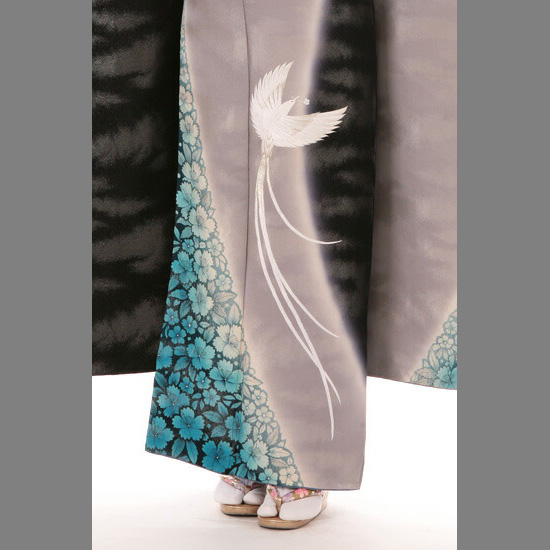 グレー、ブラック、そして裾は花文様のブルー。それぞれの色の際(きわ)にはぼかしが入り、柔らかな色合いを作り出しています。中央には白い鳥の姿。純粋無垢な美しさを体現し、なびぐ尾がとても優美ですね。小さな花をくわえているのもとても印象的ですよ。幸せを運ぶ鳥として表現されているのでしょう。ブルーの部分の花の文様は、とても繊細、そして丁寧に描かれています。ブルーなので華やかさの中に、クールで上品な雰囲気も演出します。とてもシンプルな振袖ですが、シンプルだからこそ際立つ美しさがあります。知的でクール、かつ優美で上品な振袖ですから女性の美しさを存分に引き立てること、まちがいないでしょう。
