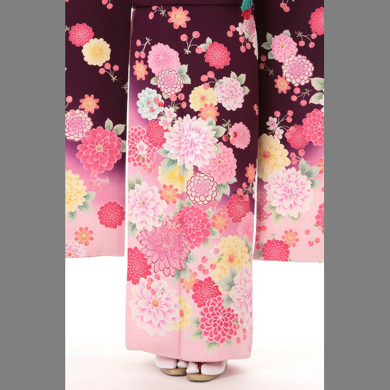 あふれるほどに描かれている菊とさくらがメインモチーフのお振袖です。上半身はパープル系でおとなっぽい印象の色合いになっています。それに対して裾や袖の下は明るいピンクにベースカラーになっていて、かわいらしい印象です。メインモチーフのひとつになっている菊のお花は、黄色、淡いピンク、濃いめのピンクなど、色とりどりに描かれています。ホワイトとピンクのグラデーションになっているお花もありますね。さまざまなカラーやフォルムがあり、とても華やかです。暖色系のお花が多い中に、ホワイトと淡いライトブルーの菊がデザインのアクセントになっています。かわいらしいフォルムやリアル感のあるテイストなど、いろいろな描き方がされている菊。その菊には浄化や邪気を払う力があると考えられていたそうです。とても縁起のよいお花なのですね。そんな菊の中にところどころ見え隠れするさくらのお花があります。大きさも小さめなので控えめですが、そこがさくららしい美しさをあらわしているようです。さくらのお花だけではなく、さくらんぼもデザインされているのがこのお振袖のポイントです。菊とさくらの組み合わせはときどき見かけるデザインですが、さくらんぼも一緒に描かれたデザインはなかなかありません。