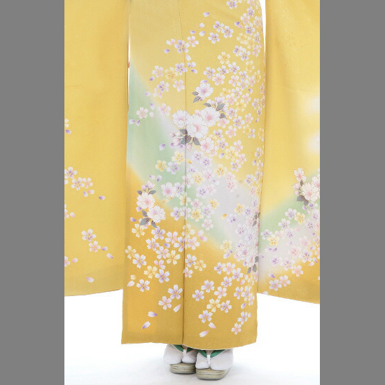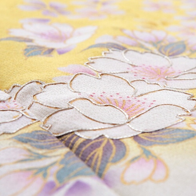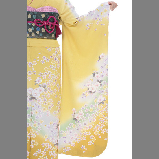 トーンの高い黄色いお着物に白いさくらが美しいデザインですね。黄色系のお振袖はあまり多くはありませんので、貴重な1枚です。お着物の世界では、お着物描かれた草花はその花の咲く時期か少し季節を先取りして着るのがよいと言われています。さくらは春に咲く花というイメージがあると思いますが、春だけではなく、1年を通して着られる特別な花なんです。理由は、日本を象徴するような花だから、や、寒桜など春以外でも咲いているからなど諸説あります。今は花の美しさを愛でるお花見も、ずっと昔には稲の豊作などを願ったそうです。そのことから、さくらのモチーフには豊かな人生を授けるという意味も込められているそうです。こちらのお振袖には、ちいさめのかわいらしいさくらの花がたくさん描かれています。まるでさくら吹雪のようで、とても美しいですね。裾や袖に少し入っているグリーンのラインがデザインのアクセントになっています。グリーンが入ることで、かわいらしさの中にもちょっとシャープな印象が加わります。葉っぱの描かれた少し大きめのさくらの花にはシルバーのししゅうで花びらがふちどられています。ゴールドより色は控えめですが、だからこそさくらの繊細な美しさをより引き立てていますね。