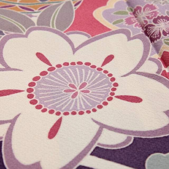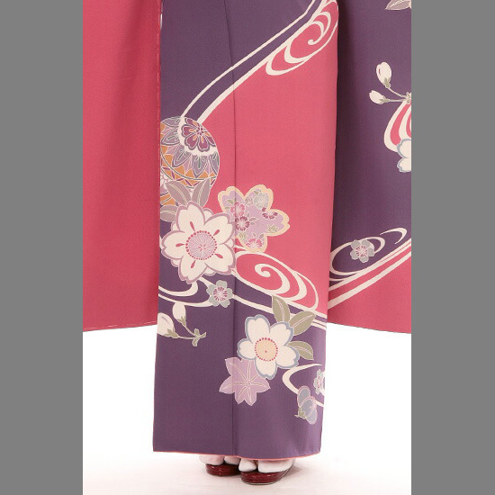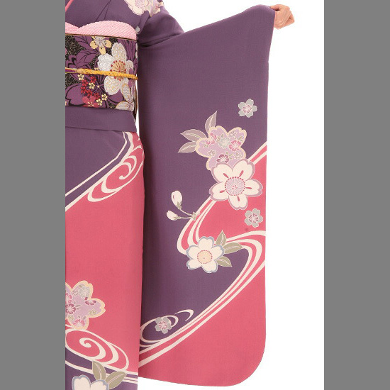 ピンクと紫の色が持つ、ほのかな色香がやさしく、「桜」の文様がかわいらしい振袖です。描かれている桜には、バリエーションがつけられています。丸くかわいらしくデフォルメされた桜。形の中に、さらに「撫子(なでしこ)」の花が描かれている桜。丸くかわいらしくアレンジされた「もみじ」も添えられています。花だけでなく、少女の遊び道具である「手毬(てまり)」も、一緒にえがかれることで、小さな子の持つ愛らしさが加わります。また、手毬には「魔除け」の意味もあり、お召しになる方の幸福を祈って描かれています。落ち着いた色調なのにあでやかさもあるのは、柄のない余白の部分が、多く取られているため。しかし、寂しくないのは、きっぱりと大胆に染め分けられているからです。染め分けられた部分には、「流水」の文様も描かれ、全体に大きな動きを出してくれています。成人式だけでなく、およばれの結婚式などにもぴったりなおキモノです。