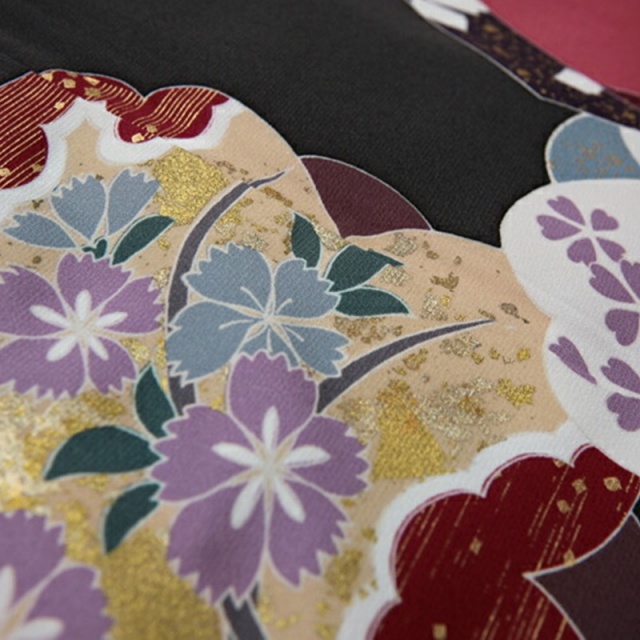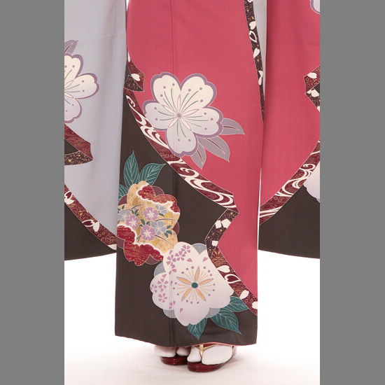 落ち着きのあるピンクの地色に、大きく描かれた「桜」の文様が、かわいらしい振袖です。手のひらと同じくらいに、大きく描かれた桜。しかも、本物に近い桜と、その形の中にさらに撫子(なでしこ)の花が描かれ、箔でのいろどりで、キラキラとしている桜。さらに、花びらに小花が描かれている桜、とバリエーションも豊かです。染め分け部分に沿ってある、リボンのような細く長い帯は「蔓帯(かずらおび)」といいます。能装束の1つですが、その美しさから、着物の柄としても人気があります。その手間のかかったこまかい文様で、品格を引き出しています。全体に、余白が多く取られていて、とてもすっきりとした柄ゆきなので、ふだんからシンプルなコーデが好きな方も、洋服の感覚のままお召しいただけます。裾のこげ茶が全体の甘さを引き締めて、オトナっぽい雰囲気に仕上がっているおキモノです。