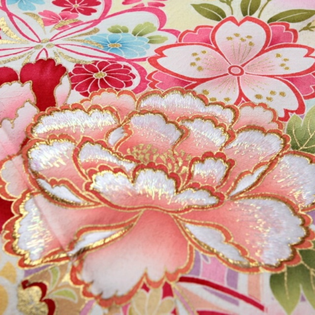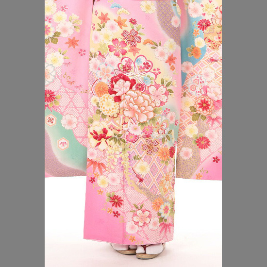ピンクを基調に、甘い配色が、まるでお菓子のようでかわいらしい雰囲気の振袖です。描かれているのは、花びらがふんわりしていて、実際の花も美しい「牡丹(ぼたん)」や、花びらの重なりがボリューミーでかわいい「八重桜(やえざくら)」、丸くて、これも花びらがたくさん描かれている「八重菊(やえぎく)」など、お姫様気分を盛り上げる花たちです。 花には、金やラメの糸で刺しゅうがほどこされ、さらに豪華な仕上がりになっています。また、ところどころにほどこされた、金彩のきらめきも、キモノならではの贅沢な装飾です。白い四角い「疋田(ひった)」とよばれるドットの文様は、愛くるしさを格上げしてくれます。花と一緒に描かれている「手毬(てまり)」は、幼い子の遊び道具ですので、乙女チックなモチーフとして人気があります。また、古典的な文様ですので、「円満」という良い意味を持ち、着る人の幸せを願うのも、好評の理由です。有職文様(ゆうそくもんよう)とよばれる格調高い文様が、背景にえがかれていて、それが気品をかもしだしています。記念日にふさわしい、かわいい装いのかなうおキモノです。