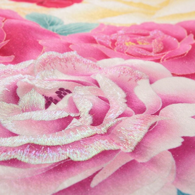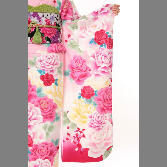 裾をぼかしたピンク地に薔薇柄の振袖は、1999年のパリコレで第42回FEC特別賞受賞のファッションデザイナー・ヒロミチナカノの一枚です。ヒロミチナカノといえば1980年代のDCブランドを支えたデザイナーの一人として有名ですが、制服を手掛けたことでも知られています。中・高校時代にヒロミチナカノがデザインした制服を着ていた方には、聞き覚えのあるブランドではないでしょうか。ピンク地から湧き上がるように描かれた大輪の薔薇。その大輪の薔薇からも浮き上がって見える小ぶりの紅薔薇には、裾や袂の紅色と同色が使われています。この鮮やかな紅色を使うことで、ピンク色が持つ子どもっぽい印象を抑えています。薔薇とたわむれる蝶にも、同じ紅色が使われています。蝶には「立身出世を含む未来の開拓」の意味があり、人生の岐路に立つ女性を応援する柄。特別なシーンに臨むにふさわしい振袖ですね。