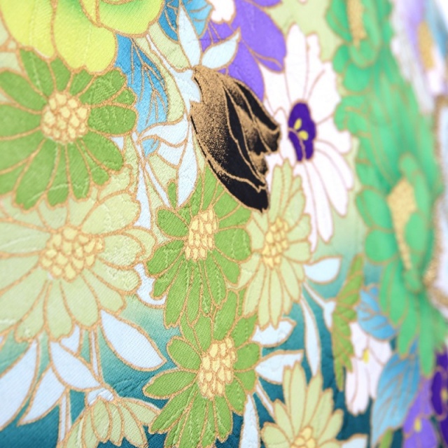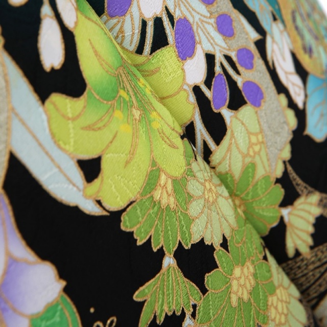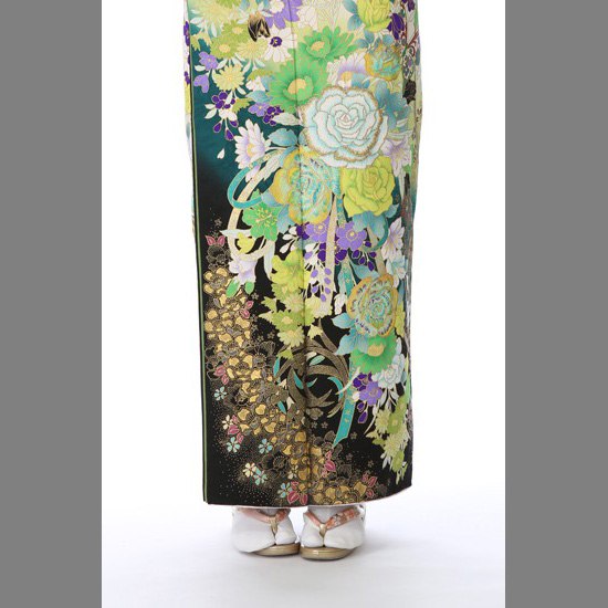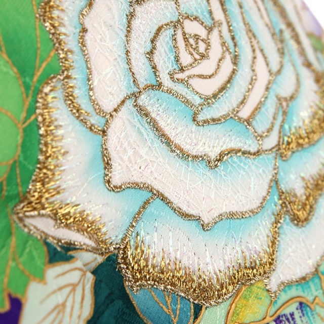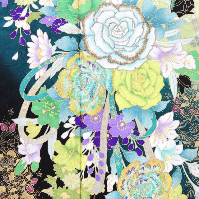どの方向からも美しく魅せるのが桂由美のデザイン。和装だって、正面はもちろん、袖や袂、後ろ姿までもが華やぎに満ちています。独創的な柄行が新鮮なこちらの振袖も、自信たっぷりに装える一枚。フォーマル感のある地色の上に、グリーンや紫で彩られたモチーフを巧みに置いて個性豊かな表情に仕上げています。特に美しく輝くのは、贅沢な刺繍が施された大きなバラの花。花弁に薄いブルーをあしらい、縁取りに金を使うことで、高貴な表情に。周りの金彩と共に浮き上がるような立体感が加えられています。袖や袂にさりげなく蝶が舞う様子もロマンチック。下にかけて濃い色へと変わり、足元は漆に蒔絵を描いたような優美なシーンになっています。クールカラーで彩られた贅沢な世界。桂由美デザインの醍醐味を思う存分味わうことができます。