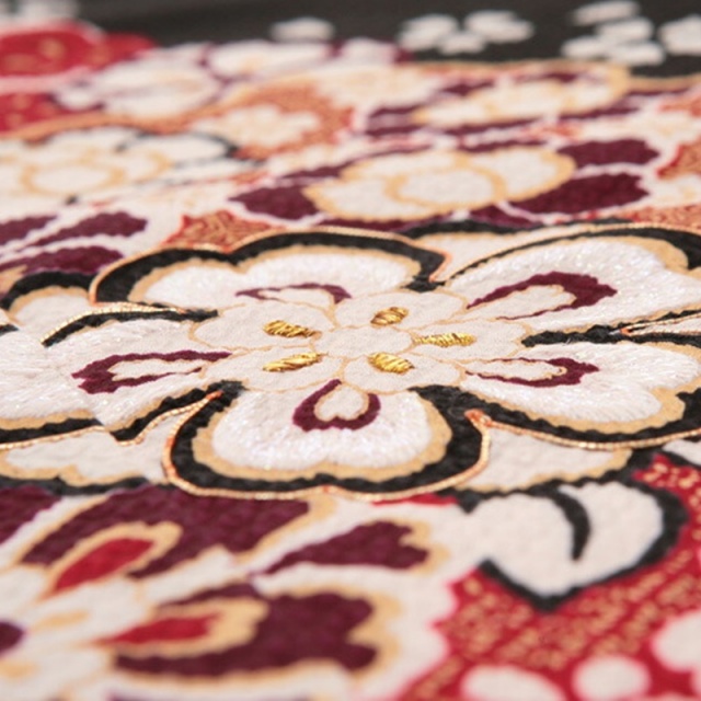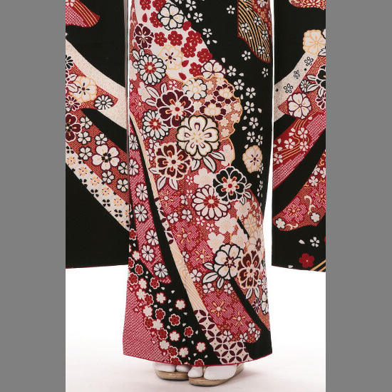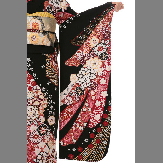 黒色の地色に赤のモチーフが美しい振袖、シックな雰囲気の中に香り立つ美しさを感じます。振袖に流れるように描かれている「八重桜(やえざくら)」。桜は五穀豊穣の神が宿るとされ古くより新しい門出には好まれて使用されています。さらに八重桜となると花びらが幾重にも重なって咲くことから「知恵や知識が多く備わっている」とされ学校などに植えられている所以です。「豊かな教育」や「高尚・理知に富んだ教育」など見た目よりも内面の美しさを表現したとされています。桜と共に描かれている菊の花は、「長寿」の象徴であるほか、「無病息災」や「邪気祓い」の意味があります。そのほか「高貴」や「高尚」などの意味もあり天皇家や皇家の菊花紋章(十六弁八重表菊紋)としても有名ですね。お袖には花の中で百花と言われる牡丹の花があります。牡丹の花は「幸福」や「富貴(ふき)」の意味があり、その素晴らしく咲く様から美しい女性の座る姿にも例えられています。咲き誇る花々全体を束ねている熨斗(のし)は、人と人の繋がりを大切にし、幸せを分かち合って欲しい絆の意味が込められています。長生きして豊かな教育と人々の繋がりを深めて欲しい願いのこもった振袖なのですね。