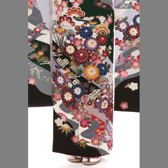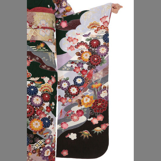 大人女性のニュアンスを漂わせる深いグリーン地に、流水を背景とした百花の園を配したエレガントな振袖です。百花とは、さまざまな花々のこと。百花の園は、春夏秋冬の花々が咲く花園のことです。上前正面を見てみましょう。白やグレーで彩色された流水の岸辺に、多彩な吉祥文様が配されています。吉祥文様とは、ひとことで言えば「おめでたいしるし」。たとえば、菊の花は古代中国で仙花といわれ「延命長寿」を象徴する花として日本に伝わりました。牡丹は「富貴」を意味し、その豪華さから「百花の王」とも称されます。おめでたい松や梅が描き込まれているほか「魔除け」を意味する菖蒲や清らかな姿が好まれて来た桔梗も可憐に咲いています。裾には、愛らしくデザイン化された笹の葉も。笹も吉祥文様のひとつです。向かって右袖は、袖口に大きな瑞雲が置かれています。上前正面の模様と趣を少し変えているようで、実はシンクロしているのは配色の妙から来ているのでしょうか。紫の色遣いが優雅です。この振袖は、大人女性の落ち着いた佇まいを演出。さまざまなハレの日のシーンで存在感を放つお着物です。