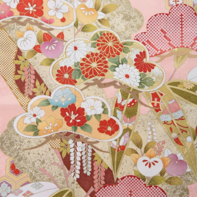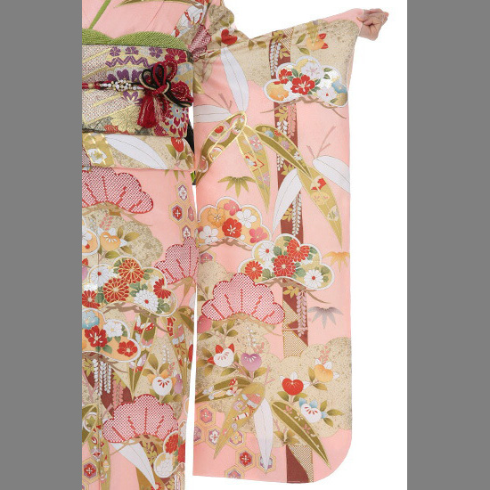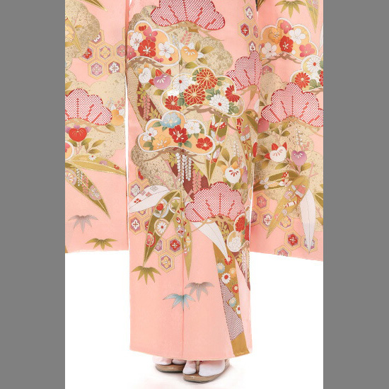 肌色に近いピンクは、肌なじみがよく、どちらかというと、イエローベースの方によく合いそう。正統派なデザインがお好きな方へ、「松竹梅」がテーマのお振袖はいかがでしょう。松竹梅って、古くからある伝統的なイメージですけれど、実は割と身近な存在です。おめでたいものの側には、よくこの松竹梅がいる気がします。松が大きめにデザインされているのですが、雲のようにふわふわとした輪郭が可愛らしいです。実は、背景には金箔づかいの雲紋(うんもん)も隠れています。正統派な文様を、可愛らしく装えるのがとても魅力的。もちろん、松竹梅だけでなく、そのほか菊や橘(たちばな)、椿、牡丹に藤と、たくさんの和花がさりげなく描かれています。どれも主役になりうるモチーフですが、メインの松竹梅を邪魔しないようにバランスよく散りばめられています。薄色のお振袖は、見た目もそうだけど、気持ちもエレガントにしてくれます。おめでたい気分を最高に高めてくれる、上品で雅なお振袖です。