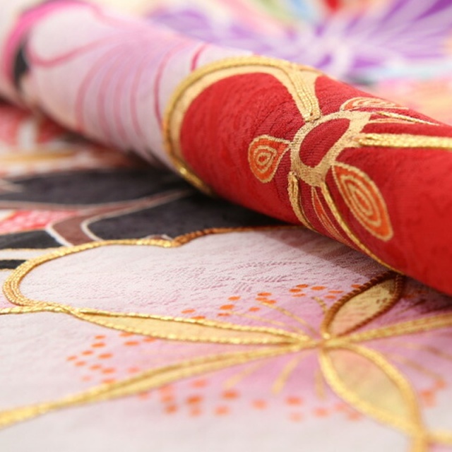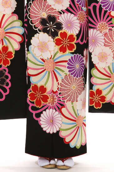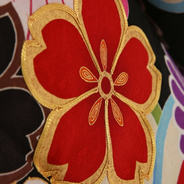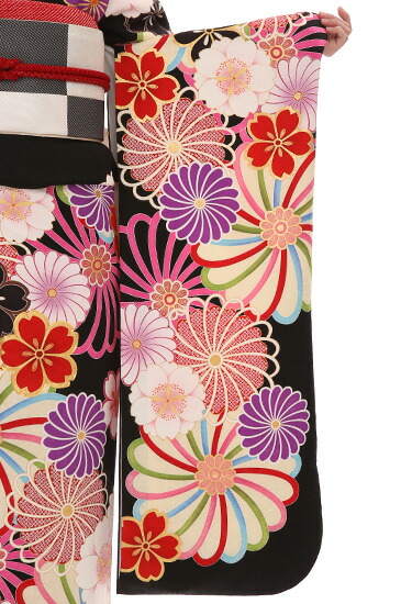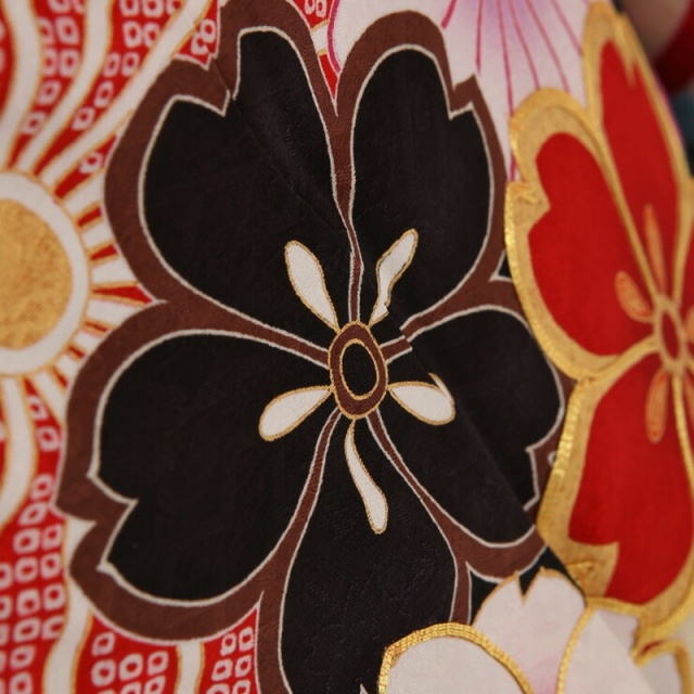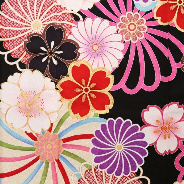 こちらは黒がきわだつとても印象的なお振袖です。お着物が深い黒なので、白や明るい色で描かれたお花のモチーフがよく映えます。まるでうかびあがっているように見えて、とてもうつくしいですね。メインのモチーフになっているお花はさくらと菊です。どちらも日本を代表する花といってもよいくらい身近で親しみのあるお花ですね。さくらの「さ」には稲という意味、さくらの「くら」には神様が宿る座という意味があるそうです。美しさだけではなく、豊かさの象徴でもあったのですね。今もさくらの美しさは私たちを魅了してやみませんが、かつては今より神秘的な存在だったのかもしれませんね。もうひとつのモチーフの菊はおめでたい柄とされる吉祥文様のひとつです。皇室の御紋にも使われている菊の花は高貴な花と言われていました。長寿や邪気を払うという意味もあるそうです。こちらのお振袖では、紫や赤の菊や、白の菊など、いろいろな色で描かれています。花びらのふちが赤やピンク、グリーン、ブルーなどで彩られているものもあります。古典的なモチーフですが、明るくポップな色づかいが現代的でかわいらしいですね。