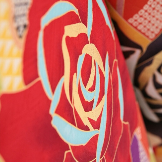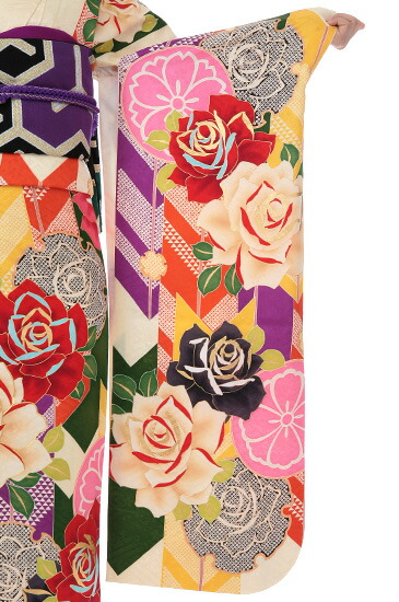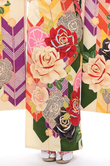 匂い立つ美しさをはなつバラと縁起物の矢羽根の組み合わせが斬新かつ華麗な一着。華やかな美しさだけでなく、柄の持つ意味も込めると淑女のような装いになれる振袖です。クリーム色の地色に大胆に華やかに咲くのは、大輪のバラです。ピンク色のかわいい桜をちょこんとあしらっています。愛・美・純血・喜びの象徴といわれるバラは、ご存じのとおり誰もが美しさにうっとりしてしまう花。装う人を優雅に魅せてくれると同時に、周りを華やいだ雰囲気にしてくれます。バラの背景には、レトロな色合いで描かれた矢羽根文様です。矢絣(やがすり)文様ともいわれます。矢は『的を射る』や魔除けの意味から、縁起が良く幸せのしるしとされる吉祥文様になります。矢を弓で射ると決して戻ることがなく真っすぐに進むことから、江戸時代には縁起をかついで矢羽根文様の着物を嫁入りの支度に持たせたほどです。明治~大正時代にかけて矢羽根文様の袴姿が女学生の間で大流行。その流れから、矢羽根は現代でも、女学生の卒業式の定番モチーフになったといわれています。華麗なバラが淑やかな優雅さを、レトロな矢羽根があどけない可愛らしさを表しています。それぞれの柄に込められた意味を踏まえても、結婚式などの華やかな席やお祝いの席にふさわしい振袖です。また、卒業式で定番人気の矢羽根柄を、振袖姿で行かれるのもかえって新鮮でしょう。ちょっぴり大人びた淑女スタイルで、卒業式に出席されるのはいかがでしょうか?