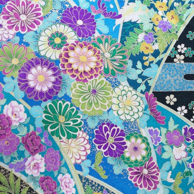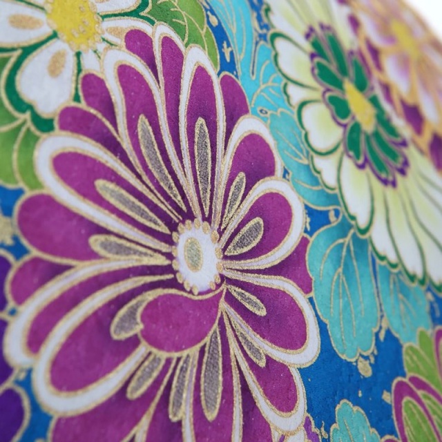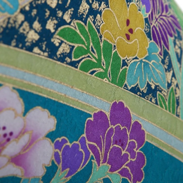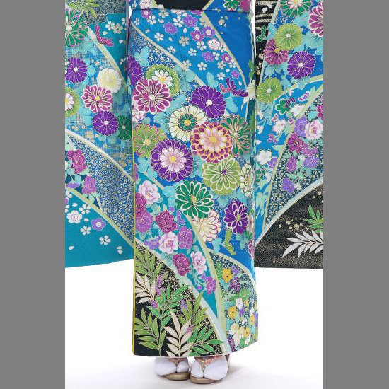 目の覚めるようなブルー地の振袖は、和装に新風を吹き込んだ世界的なブライダルデザイナー桂由美によるデザイン。裾先と袂先に置かれた黒地を背景にした葉っぱと撒糊散らしが醸す南国ムードが新鮮です。斜め取りした柄付けの地色に異なるブルーの色相を選び、洒脱なニュアンスを表わしています。おはしょりのすぐ下の斜め取りには小花を散らし、可憐な印象を。上前中央はゴージャスに。特に赤紫の菊には金駒刺繍をほどこし、立体的な美しさを表現。その刺繍菊を中心に咲き誇るエメラルドグリーンや紫の菊たちは愛らしい表情です。それらにロマンティックな印象を足しているのは、濃淡のある紫色や淡いピンクの洋花たち。逆に、向かって右袖には、裂取り風の黒が視覚的にシャープな印象を放つように使われています。黒地に引かれた横の銀色ラインも、クールです。この振袖は可憐で気品に満ちた一枚として、ハレの日に臨むことのできるお着物です。