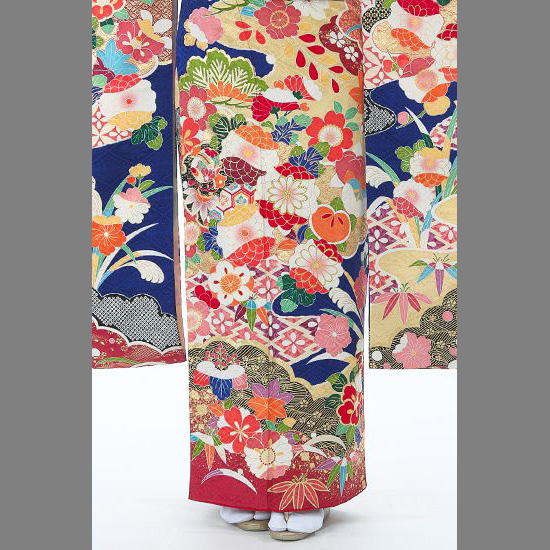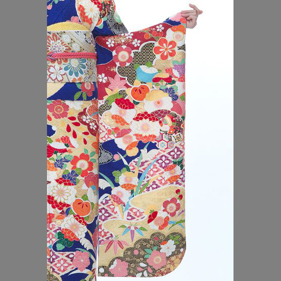 フレッシュな青がまぶしいほどの輝きを放ちます。溌剌としていて健康的。若々しさがほとばしっているようです。肩から袖、袂へかけても贅沢に文様が配されて晴れやかな印象。明るい色目で描かれた菊、橘、梅などは吉祥文様であり、どれも特別の思いが込められています。菊は皇室の紋章としても知られる高貴なモチーフ。健康や長寿を願うときにも用いられる瑞花です。独創的に意匠化された花弁は金の刺繍が施され、晴れの日にふさわしく光輝いています。丸みを帯びた文様が多い中、松皮菱文や花菱亀甲など直線的な柄行を入れることでボリューム感をプラス。さらに金彩で描かれた波文や雲取りなどの古典柄が重なるように描かれ、圧倒的なパワーを感じさせます。絢爛豪華な柄行は、振袖だから楽しめる世界観。咲き誇る花のように注目を集める存在となれるでしょう。