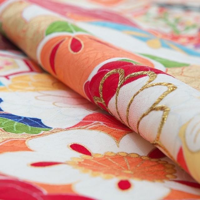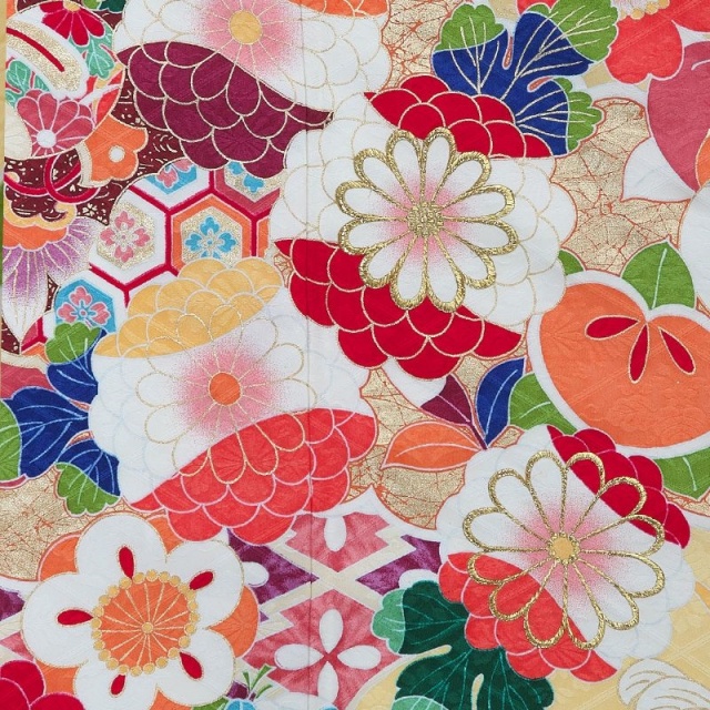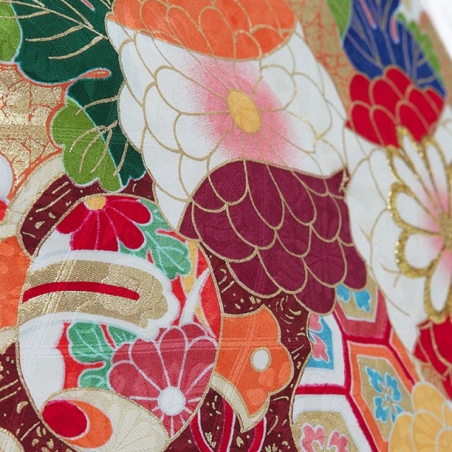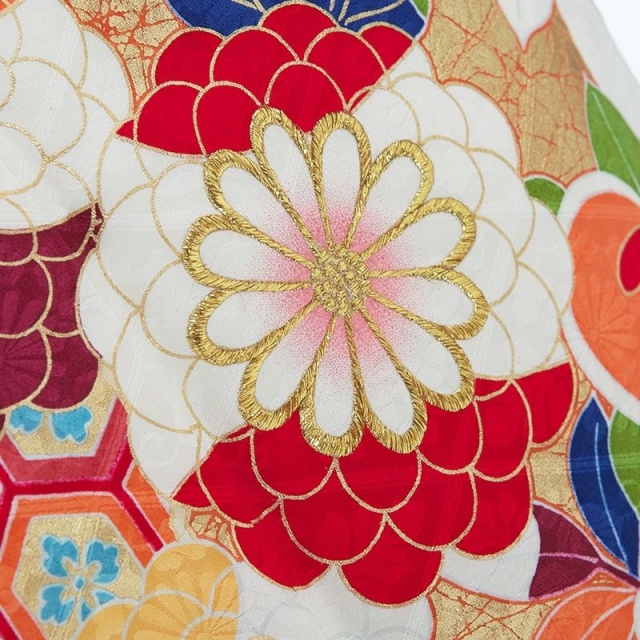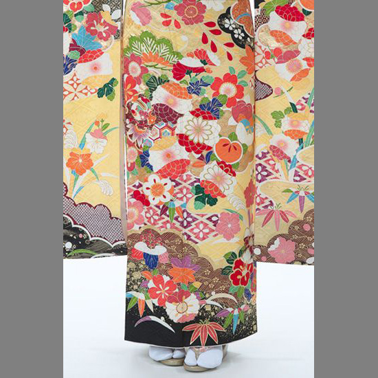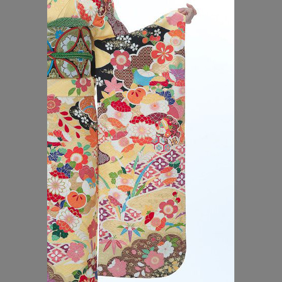 晴れの日を彩るにふさわしい優雅な地色。花菱綾の地模様が柔らかく浮かび上がり、上品な光沢を放ちます。伝統的な吉祥文様をポップに散らした柄行は、モダンなテイスト。様々な色を使うことで、より華々しい印象に仕上がっています。特に花や木のモチーフはどれも楽しげ。八重菊は花弁を何色にも分けて、さらに金糸の刺繍で豪華さをプラスするなど、凝った意匠が見どころです。冬でも葉を茂らす松は瑞々しい色使いで描かれていて、まさに常盤木らしいデザイン。繁栄の願いが込められた橘は丸みを帯びたフォルムで可愛らしく表現されています。花たちに囲まれて打出の小槌が置かれているのも楽しい演出。裾にかけては重厚感ある濃い色目を使って、雲取りや箔を引き立てています。惜しみなく装飾を施した豪華な振袖は、一生の思い出を作ってくれるでしょう。