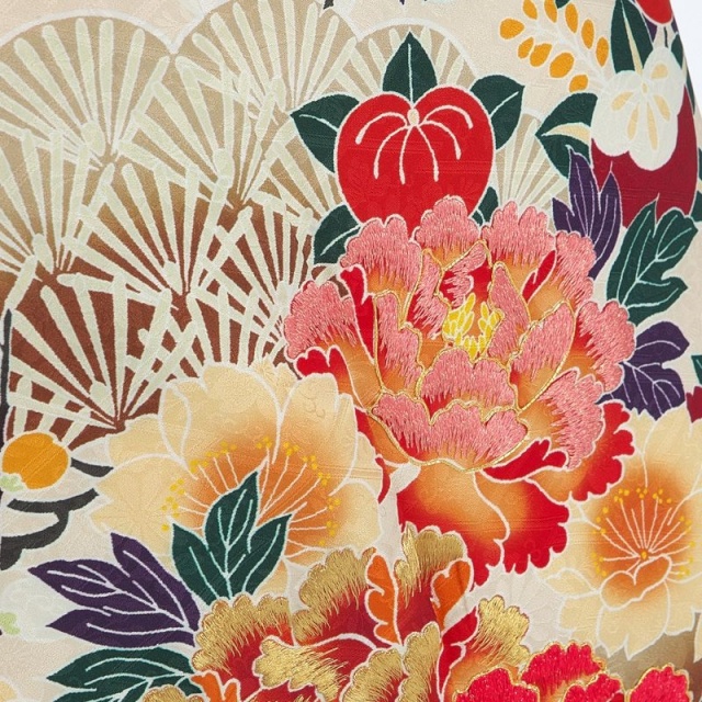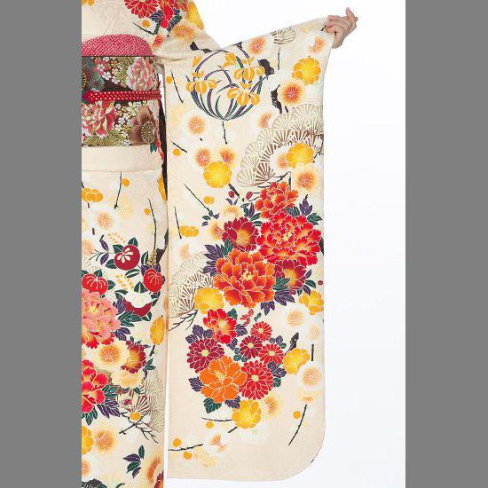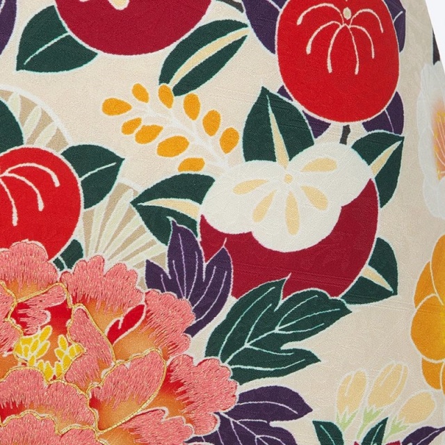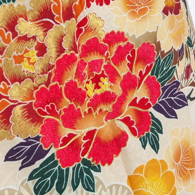 格式を備えた和装には、ドレスさえかなわない華やぎがあります。美しい柄行で魅せる振袖なら尚のこと。古典的な文様を贅沢にあしらったこちらの振袖も、晴れの日にふさわしいゴージャス感が漂います。地色の美しさも注目ですが、花を置いた松皮菱の地模様もひときわ目を引く華麗さ。地模様が施されていることで、柄の描かれていない余白部分さえ独特の光沢を放ち、ちょっとした仕草もエレガントに決まる演出です。陽光の下ではもちろん、パーティー会場などの柔らかな照明の下でも、上品に映えるでしょう。華やかに輝く牡丹は、百花の王の名にふさわしい貫録。花弁の細やかな濃淡は、刺繍で表現されていて立体的な表情になっています。枝松や梅といった伝統的な祝い文も揃って、めでたさを盛り立てているよう。花の持つ気品、あでやかさ、繊細さを盛り込んだ究極の装いです。