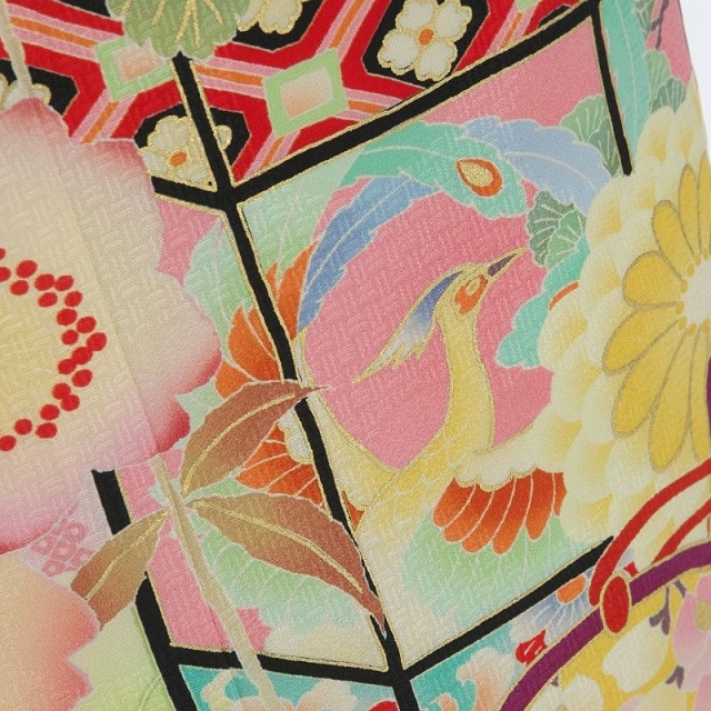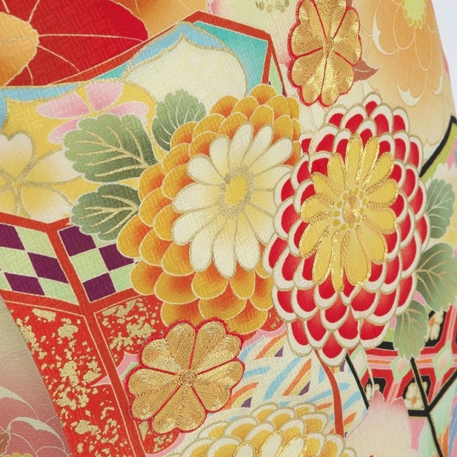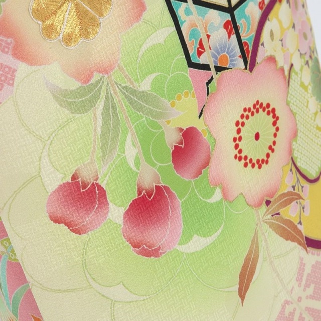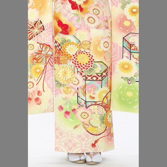 カリスマモデルの越智ゆらのさんと着物ブランドKamiShibaiがコラボし素敵な振袖が仕上がりました。クリームイエローの地色に薄ピンクの七宝文様や亀甲文様をあしらい可愛らしさを引き立てていますね。振袖の絵柄には素敵な意味が込められています。6角形の箱のようなものは「貝桶」といい平安時代より貝合わせと言う遊びに使った貝殻をしまう箱です。貝合わせは二枚で一つの貝となるため「良縁」や「夫婦和合」の意味があります。そのため幸せな結婚を祈願する意味で女性が嫁入りする際は持って行った嫁入り道具の一つです。その箱に素敵な蒔絵や金箔を施し豪華にしています。貝桶の横に描かれている鼓は音色が美しく、神に伝える神事の一つとされ使用されてきました。優雅な形に品格があり物事が「良く成る」ようにとの願いが込められています。貝桶と共に描かれている菊の花は「長寿」や「無病息災」などの意味が込められていて古来よりおめでたい絵柄とされています。世界中の人々から愛されている日本の象徴としても有名な桜の花は「五穀豊穣の神」は宿るとされ「豊かさ」や「新しい門出」に好まれて使用されています。そのほか「精神の美」や「優美な女性」の意味もあるようです。