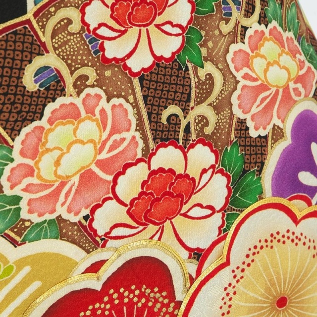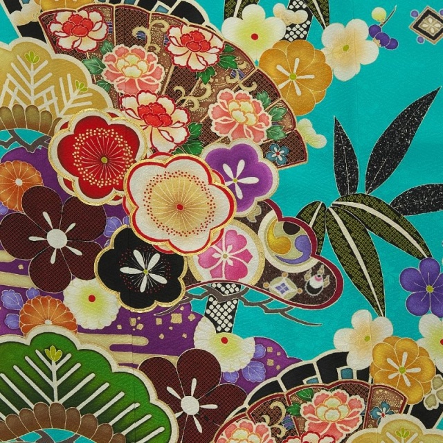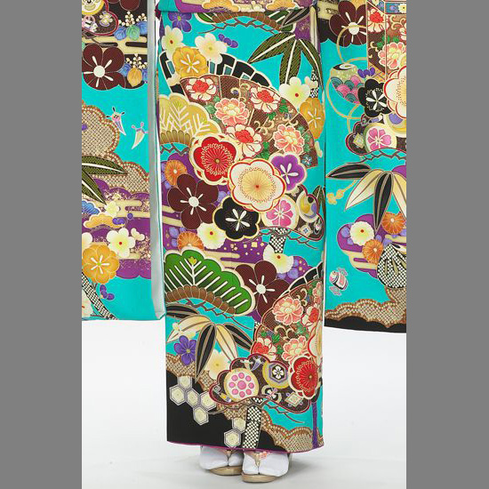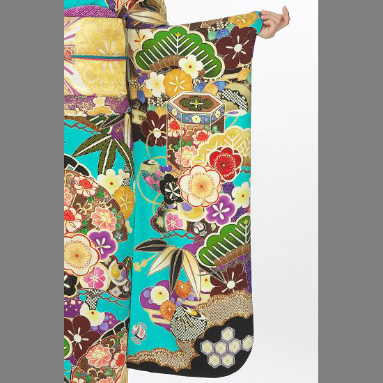 地色の明るいエメラルド色が遠くからも目をひく、モダンな振袖です。はっきりとして、色だけで存在を主張できるエメラルドグリーン、振袖を含め着物ではなかなか見ない色ではないでしょうか。絵柄は、扇、貝桶と松竹梅を中心とした植物、いずれも、縁起の良い絵柄です。扇は、末広がりの形をしていることから、明るい未来や開運を予感させるものとされています。貝桶は、公家や武家の姫君が遊ぶ貝合わせの貝を収める容れもの。裕福な子女の持ち物であることから豊かさを表すものとして、また、貝合わせの貝には夫婦円満の意味があることから、縁起が良く晴れ着に相応しい絵柄とされています。松竹梅は、いわずとしれたおめでたい植物の組み合わせですね。こちらの振袖では伸びやかな筆致で描かれており、丸さが強調されたデザインには若々しさがあふれています。これらの絵柄が、振袖らしくたっぷりと、帯下と袖を埋め尽くすように描かれています。地色のエメラルドは寒色系、柄に使われている色は紫、茶、黒と渋めが多いため、振袖らしい華やかな絵柄ながら、個性的な大人の雰囲気に仕上がっています。ご自身をお洒落に演出したい場面でのモダンで大人っぽい装いとしてお薦めの振袖です。