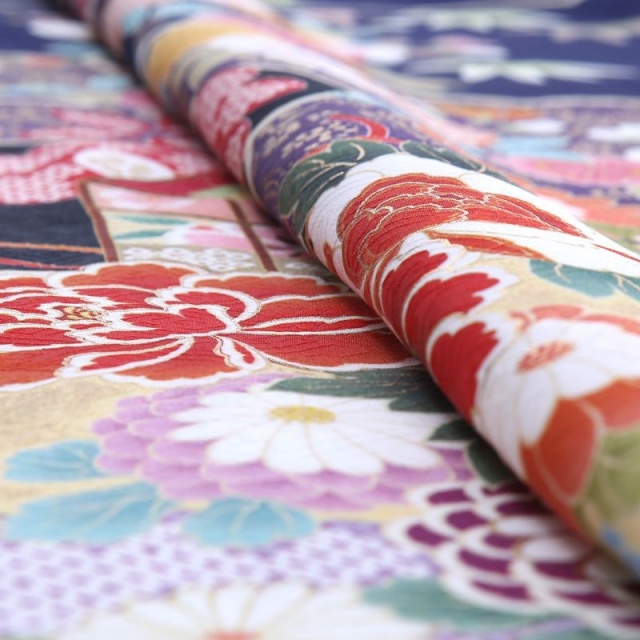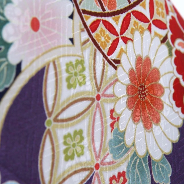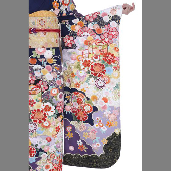 紺色の地色に雲取り(くもどり)をほどこした上で、貝桶、牡丹と菊を中心として花々を描いた振袖です。文様の下に見える、大きな雲の形の装飾を雲取りと呼び、その名の通り雲の輪郭をとり、その中の色を違えたり、装飾をほどこしたりすることをいいます。このような装飾には雲意外にも種類がありますが、雲は空高くにあり、心理的にも現実の世界からの距離があることから、どこか幻想的な雰囲気を漂わせます。中心に描かれているのは貝桶、公家の姫君などが遊ぶ貝合わせの貝を仕舞っておく、美しい容れものです。貝合わせには夫婦和合の意味もあることから、婚礼に関する行事などにはとても相応しい文様です。もちろん、礼装によく見られる古典的な意匠のため、それ以外の用途でもお召しいただけます。そして、その周りを彩る花々は、赤、ピンク、朱と暖色系を中心に、多彩な色遣いではれの着物らしさがあふれます。地色が濃いと、文様がたっぷりあってもどこかすっきりした印象になりますね。また、お顔写りをはっきりとさせてくれる効果もあります。振袖らしい豪華な華やかさの中にも、落ち着きや大人の女性らしさを感じさせたい方にお薦めの振袖です。