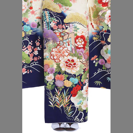 地色にクリーム色と紺色の二色を遣い、牡丹の花と御所車を中心に四季の草花を描いた、お洒落な振袖です。地色は、クリーム色と紺色の二色遣い。紺色を中心に、左は肩から帯下あたりまで、右は袖の上部にクリーム色を遣っています。描かれている文様は、牡丹の花と御所車、そして四季の草花です。牡丹は豊かさと美しさを象徴する富貴(ふき)の花。その豪華な姿から百花の長といわれています。御所車は平安貴族の乗り物、源氏物語などの絵巻を思い出される方もいらっしゃるのではないでしょうか。美しく装飾されており雅な雰囲気をまとうことができるため、礼装の着物を中心に和装では人気の文様です。これらの周りにも、藤や菊、松竹梅などを色鮮やかに描いています。二色の地色がいずれもベーシックな色のため、文様の鮮やかな色遣いが引き立ちます。地色が二色ぼかしというのは晴れ着には少なくありませんが、こちらの振袖の特長は、右肩と左肩が完全に二色に分かれていること。お顔のすぐ下にくる肩周りの色が左右で異なるため、写真の撮り方で印象が変わるなど、他にはない楽しみ方があります。ぱっと一目で目立つ個性ではないけれど、ちょっと他とは変わった楽しいものを、そんな装いをお探しの方にお薦めの振袖です。