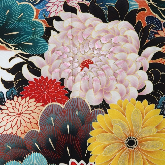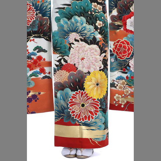 人気ファッションブランド「SPIRALGIRL(スパイラルガール)」の振袖です。ブランドコンセプト通り、ベーシックな文様であるのに、キモノを埋めつくすようにダイナミックに描かれていて、かっこよさとセクシーさをともなう振袖に仕上がっています。描かれているのは、花びらをぽってりと重ねて描かれた数種の「菊」や、大輪のうつくしい「牡丹(ぼたん)」、少しちいさく描くことで可憐さが強調された「梅」。そして、その背景には、重厚に描かれた「松」。その深い緑や、青みがかった色合いが、さきの花たちを引き立て、うつくしく映え、その存在感を際立たせています。また、花びらには、金の糸や色糸で刺しゅうが添えられ、立体的で豪華な仕上がりも魅力です。白の地色に裾はオレンジと赤。そして金のラインも独創的です。個性派さんの、おしゃれな感覚が活かされるおキモノです。 成人式だけでなく、パーティーはもちろん、花嫁衣装としてもステキな1枚です。