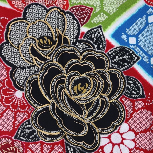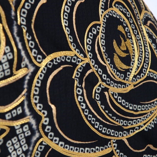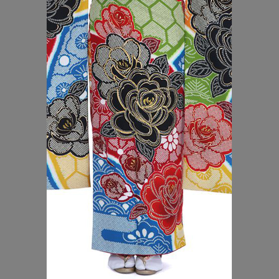 「個性的!」というひと言がぴったり。写真映えもしそうで、とても人目をひくお振袖です。“ママ振り”のような、レトロチックな雰囲気もあります。いくつかのポイントにわけて、このお振袖の魅力をお伝えしますね。まずは、カラフルな多色使いであること。赤、青、緑、黄、オレンジ、紫、黒、白。この色合いが、全体をレトロっぽく見せてくれます。赤とか、白とか、一色だけのお振袖よりも、確実に目立ちますよ!続いて、大ぶりのバラ。バラって、和花と違ってゴージャス感があります。そこをあえて、メインに黒を持ってくることで、グッと全体が引き締まるし、コーディネートのポイントにもなります。髪飾りとか、アクセサリーとか、黒に合わせてみるのもおしゃれかも。輪郭に使った刺繍も、黒に金なので、より見栄えがしますよね。もう一つは、疋田柄(ひったがら)です。小鹿の背の斑点に似ていることから、鹿の子(かのこ)とも呼ばれます。小さなドットと四角が合わさった形で、全体に用いられています。遠くから見ると無地にも見えるのですが、この疋田柄が入っているかいないかで、立体感とか奥行きが全然違うんですよ。小さくても、大切なポイントです。独特のデザインに目が行きがちですが、実はしっかりと着物の技術が活かされている、上質でおすすめのお振袖です。