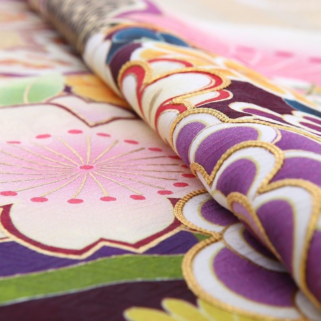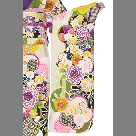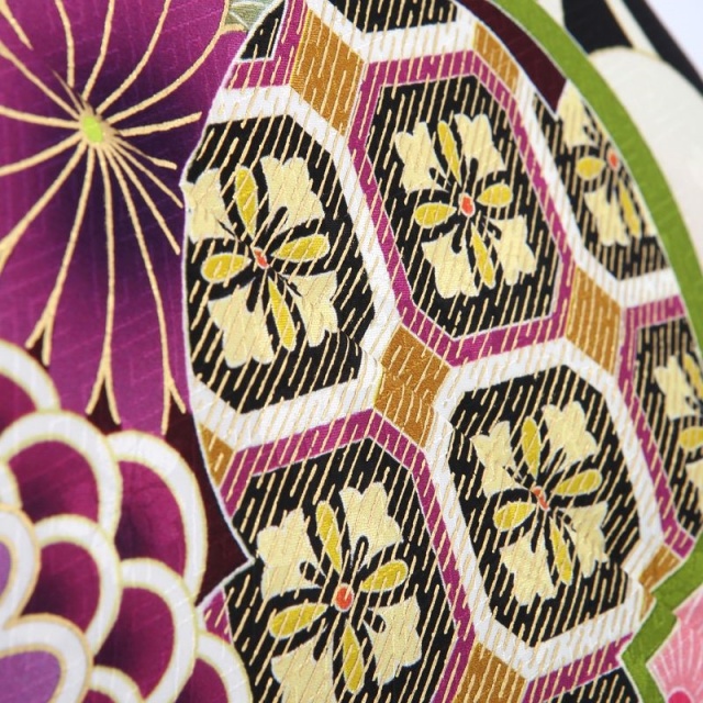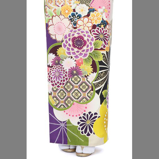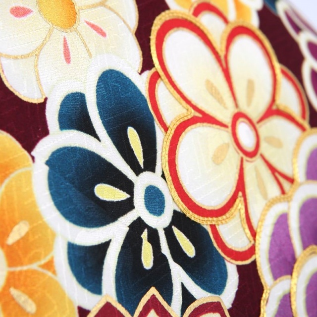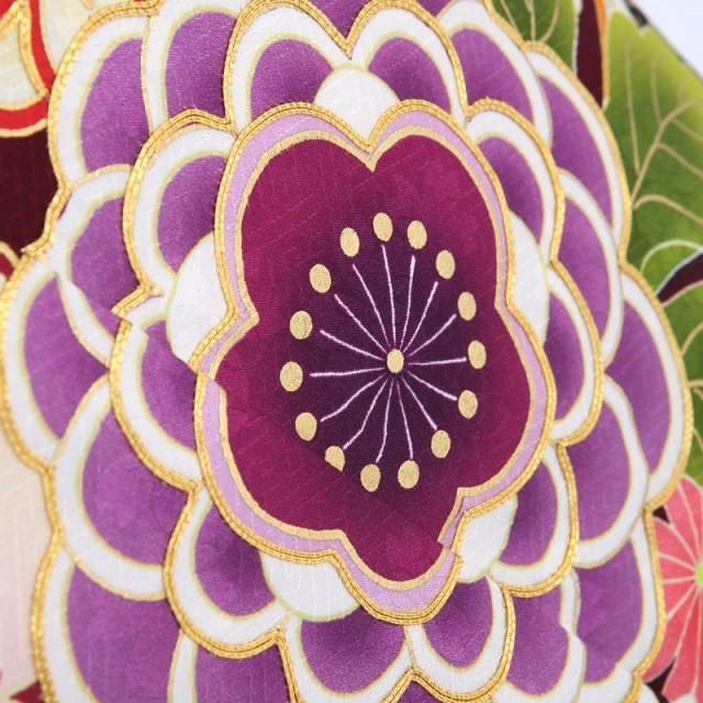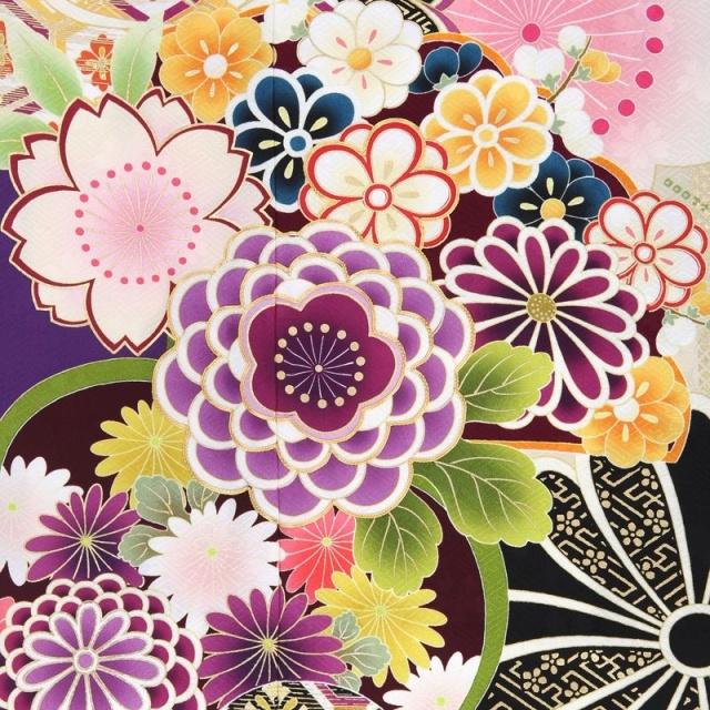 大きく描かれた菊や梅、桜の花が織りなす、和の美しさと華やかさを堪能できる一着。パッと目を引く大胆なデザインがとても魅力的です。前身頃の中央に描かれている紫の花は、菊の花に梅を重ねた形で、インパクトがありますよね。金の刺繍が施され、美しさが際立っています。梅と菊、双方の美しさが合わさり、デザイン性の高い絵柄としてお楽しみください。そのまわりを菊や梅、桜が、色鮮やかに描かれ、取り囲むようにしてお着物を彩ります。菊、梅、桜、ともに着物の絵柄として、大変でポピュラーでなじみ深い花。可愛らしく、気品ある花々が、女性をさらに若々しく瑞々しく引き立ててくれることでしょう。明るい色遣いの中にも、濃いシックな色が使われているため、モダンでしっとりとした美しさも感じられます。華やかでおめでたい場にふさわしい、おしゃれで美しいお着物です。個性が感じあれる一着ですので、着物をまとう喜びを存分に味わっていただけますよ。