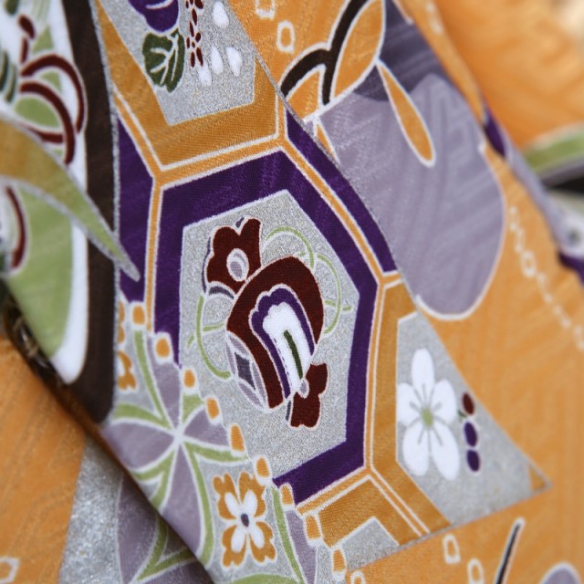 蜜柑みかんをやや薄くしたようなオレンジ「柑子色(こうじいろ)」が美しく鮮やかな晴れ着です。描かれる文様は縁起のよい吉祥文様ばかり。一寸法師の話にも登場する「打ち出の小槌」は、願い事を唱えながら振ると願ったものが次々と出てくるとされ、晴れ着に描くことで、一生において物やお金に困らないように、そして願いが叶うようにという意味が込められています。また一寸法師も物語の中でラスト立派な青年に成長することから、幼き我が子の健やかな成長を願うとされています。また大きく描かれる「松」は移りゆく季節の中で風雪に耐え、変わらない美しい緑を保ち続けるという特徴から、不老不死や長寿の意味が込められた文様です。「亀甲」は亀の甲羅をモチーフにした六角形の文様のことで、「鶴は千年、亀は万年」といわれるように、こちらも同じく長寿を意味します。「七宝」は、円が永遠に続いていくことから、円満やご縁をあらわし、これから生きていく上でとても大切なことを教えてくれるお守りのような文様と言えるでしょう。更にポイントに「絞り」が装飾されているので古典的で正統派な印象を与えます。描かれる文様も多く、とても華やかで豪華、そして気品溢れる装いをしていただけます。