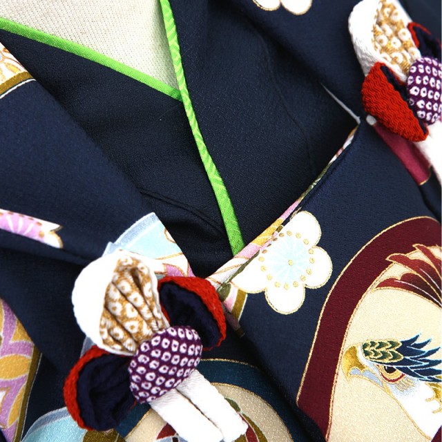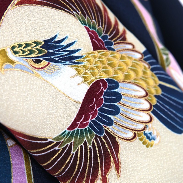 晴れ着の生地の色は、上質で格調高い紺色で染められています。紺色は、古くから親しまれる藍色を指し、鎌倉時代、戦いに挑む武士が着用する着物には藍染めの生地が使用されました。このような深く濃い色味を出し光沢を与える為に、生地を叩くという作業が行われました。その叩く作業を「かつ」と呼び「褐色=勝色」と結び付けられ、縁起のよい色とし武士に愛されるようになりました。色にも願いを込めるという日本人らしい繊細な美意識。深みのある重々しい色合いはさまざまな古人の想いが含まれているからかもしれません。古くから伝わる古典的な良さを感じられる一着です。描かれる文様は、男の子の晴れ着に古くから使用される「鷹」です。凛々しく大空を飛ぶその姿は、逞しさ神々しさを感じさせます。そして、遠くまで見渡すことが出来る鷹の目には、本質を見抜く、先を見通すという意味が込められます。また鋭い爪は、獲物を掴み離さないということから、つかんだ運や幸運を離さないという意味があります。力強く羽ばたきながら、冷静に本質を見抜いてほしい、そんな願いを込めた文様です。勇ましく立派な雰囲気の晴れ着を装い、子どもの健やかな成長をお祝いしてください。