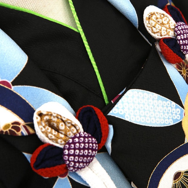 黒は格が高い特別な色で、男性の第一礼装、黒紋付の色になります。どの色味よりも重厚感があり、上質でフォーマルなイメージを与えます。正式なお祝いの日なので、やはり伝統的な正統派な装いがいい、王道がいいという方には、是非選んでいただきたい色です。威厳や力強さが出る晴れ着は、男の子の大切な節目にぴったりで、黒は立ち姿も凛とした印象を与えます。定番色ですが、描かれる文様や小物の色合わせで、雰囲気が変わるので、縁起のよい文様を引き立たせる良さもあります。被布に描かれる文様は「七宝」と「兜」です。爽やかで明るい水色の七宝文様は、永遠に連鎖し繋がることから、円満、ご縁などの願いが込められます。七宝は仏教言葉で宝物を意味するので、人の縁は宝物と同じ価値あるということを示します。そして中央に大きく描かれる存在感のある「兜」は男の子の晴れ着でよく使用される文様。身体の中でも特に大事な頭を守るお守りとして、災いから守り、健やかな成長を願う想いが込められています。また豪華な装飾がされ、格が高い武士が着用したものなので、大成や出世の意味もあります。人とのご縁を大切に感謝しながら、健康に生きてほしいという想いがこめられた上品で正統派な一着です。