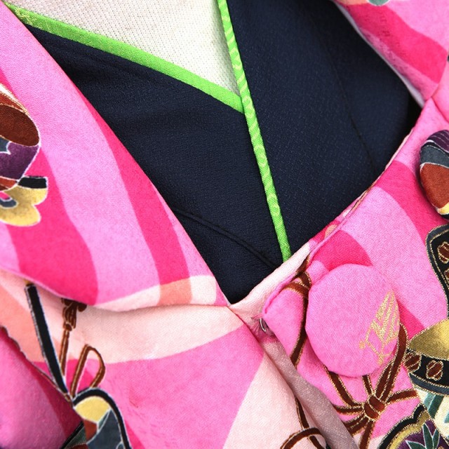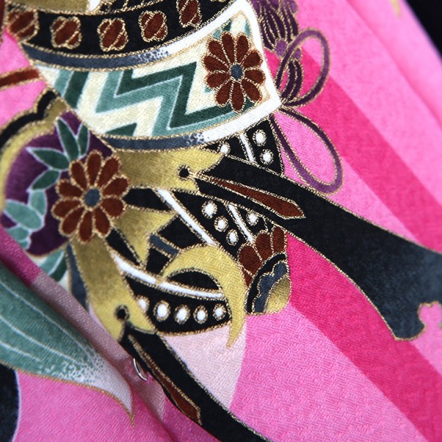 紺色は着物の定番色ですが、顔映りがいいので、写真撮影を行う場面が多いフォーマルなシーンにおすすめの色味です。そしてこの晴れ着の最大の特徴は、一際輝く鮮やかなピンク色の被布。濃いピンクは「薔薇色」と呼ばれ、鮮やかな紅色のことで「薔薇色の人生、未来」のいう意味が込められた、華やかで前向きな色、また薄いピンクは「中紅花」という由緒ある伝統色を使用しています。この2色で「縞柄」が描かれています。直線は厄除けの意味があるので、縁起のよい古くから人々に親しまれた文様です。そして他にも晴れ着に相応しい吉祥文様が全体に描かれていますが、力強い「兜」の存在感が大きいので、可愛らしすぎず男の子の晴れ着らしさが出て、格好よく仕上がっています。兜は戦いにおいて、大切な頭を守る道具として受け継がれてきました。身の安全を守る為、災いから逃れる為のお守りとしての意味があります。我が子の健康を祈り、薔薇色のような素敵な人生を送ってほしいという願いがこもった、色鮮やかな晴れ着になります。古典柄ですが、鮮やかなピンクが非常に美しく気品溢れます。人とは違った華やかで個性的な装いがしたい方におすすめです。