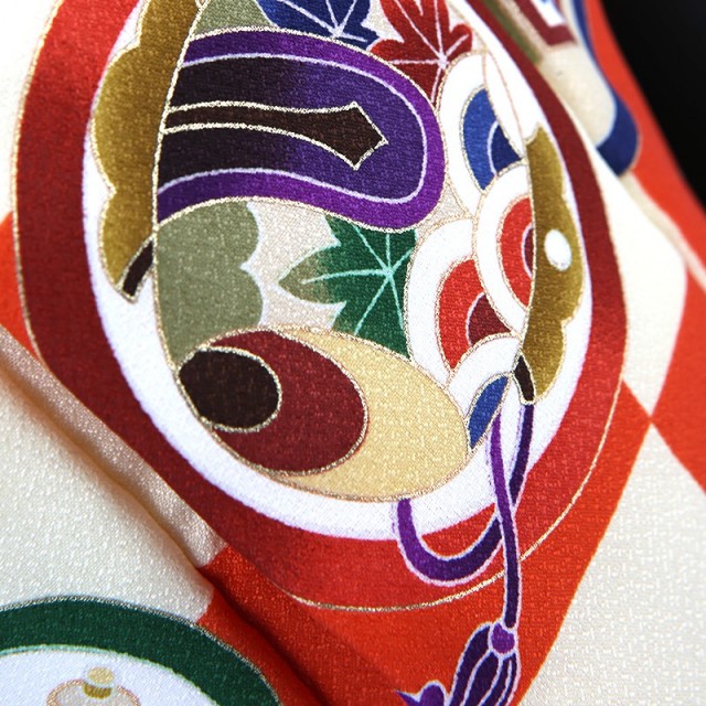 男性の第一礼装でも黒が使用されることから、やはり勇ましい印象や重厚感を与えます。人生の通過儀礼には正統派な装いを好まれる方に選んでいただきたい一着です。華やかな被布を合わせると、色や描かれる文様が際立つ色なので、写真撮影が多いシーンにぴったりです。一際目がいく黄味がかった鮮やかな赤色は「朱色」と呼び、日本の伝統色の一つ。寺院や鳥居でよく目にする色ですが、魔除けを表します。使用される色にも縁起のよい意味があるのは、日本が誇る伝統文化ならでは。そして朱色で描かれるのは「市松文様」で、チェック柄に似ていますが、日本で古くから愛される文様です。碁盤の目のように柄が続いていくことから、永遠、発展、繁栄の意味が込められています。晴れの日の装いでとても人気が高い「打ち出の小槌」は、祈りながら振ると、さまざまな物が現れるとされ、一生物やお金に困らないようにという願いが込められています。また福の神大黒天の持ち物であるので、敵を討つというという意味も含まれる縁起のよい吉祥文様です。他にも1年を通して変わらない緑を保ち続ける「松」、「亀甲」は六角形で亀をモチーフとしており、長寿を願う文様が描かれています。正統派ですが、鮮やかな朱色が素敵な晴れ着。長年愛されている文様ばかりで、格調高い装いをしていただけます。