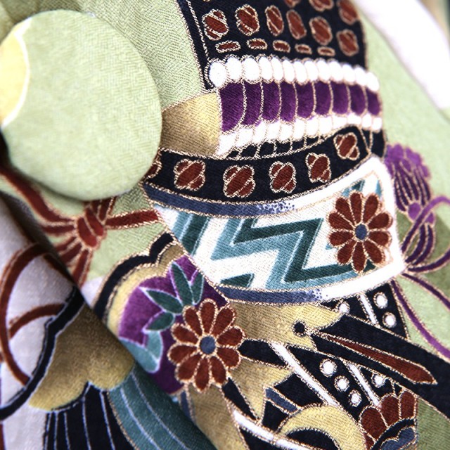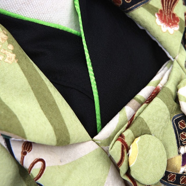被布に描かれる濃淡のある緑色が明るく前向きな印象を与えます。濃い緑は「柳色」といい、初夏の柳の葉のような明るい黄緑色です。平安時代によく使用された伝統色。淡い緑は「若芽色」といい、薄く黄色に近い色味で、植物の若芽のような若々しい新鮮なイメージで、まだ幼い子の晴れやかなお祝いの日にとても相応しい色でしょう。この鮮やかな2色で描かれる「縞柄」の直線には厄除けの意味が込められます。よく目にする縞模様にもこのような縁起のいい意味があるのです。他にも吉祥文様が沢山描かれており、「兜」は豪華な装飾が華やかで、格が高い武士のみが着用を許されるものなので、一家の男の子には大成してほしいという願いが込められます。また大切な頭を守る道具だったことから災いから守り、健やかな成長を願う意味もあります。色味、吉祥文様と共に古くから愛され親しまれるものばかり。フォーマルな場面に相応しい正統派な黒の着物。古典的さが飽きのこないデザインで、何年経っても色褪せない良さをあります。