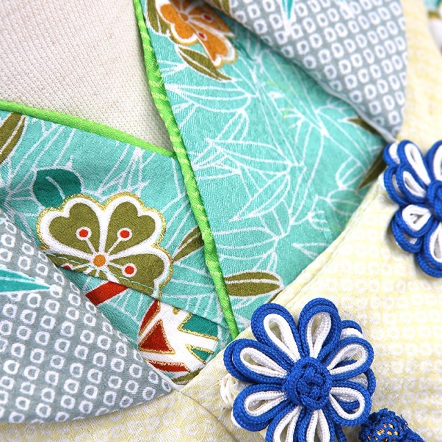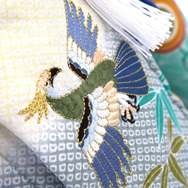 思わず可愛いと声が出てしまう、子どもらしく、色鮮やかで明るい印象の晴れ着。黄みの薄い明るい緑色は「若竹色」と呼ばれ、爽やかで若々しい色味とされ、古くより親しまれています。この着物のポイントは可愛らしい「玩具」文様で、風車、串馬、でんでん太鼓などカラフルな江戸玩具が描かれています。子供らしい縁起のよい文様は、幼い今しか味わえないので、是非楽しんでいただきたいです。そして縁起のよい植物の文様、「菊」は抗菌作用や炎症を抑える作用があり、無病息災や不老不死の意味が込められます。そして太陽のような形が華やかで縁起がよい花とされています。「竹」「梅」は、厳しい冬を超える植物なので長寿の意味や、人生で辛く厳しい時も負けずに華を咲かせてほしいという願いが込められています。またこちらの晴れ着には可愛いだけでなく、男の子ならでは「鷹」が被布の中央に描かれていて、力強さ凛々しさを感じます。鷹の鋭い目のように、物事の本質を見極め、先を見通す、鋭い爪のように掴んだ幸運は離さないという吉祥文様です。また絞りが描かれているので、更に華やかな印象を与えます。大切な晴れの日に相応しい古典的なおめでたい文様、明るい若々しい色使いをがこの着物の魅力でしょう。
