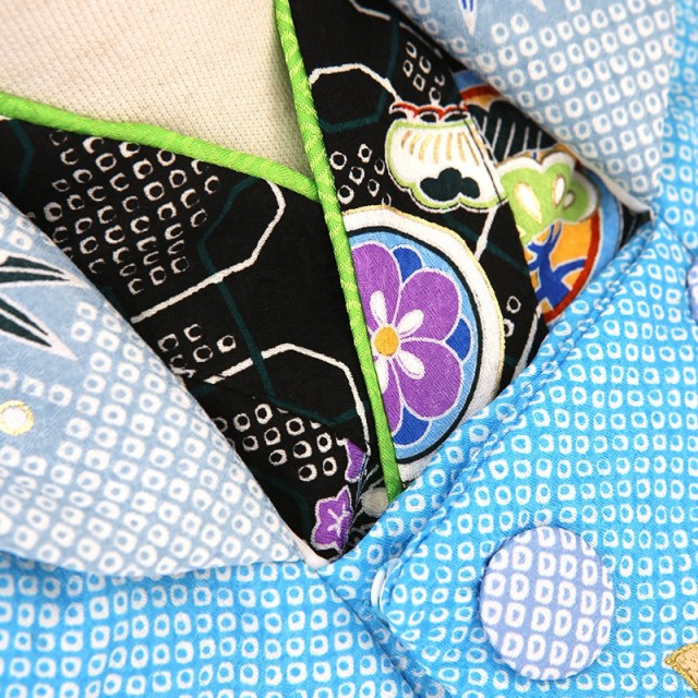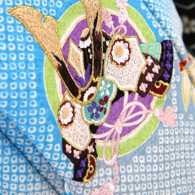 黒地の着物は上品で高級感があり、フォーマルな場面に適しています。被布の色は鮮やかな明るい水色で「 空色(そらいろ)」と呼ばれ、晴れた空のような美しい色味を表します。そして文様は縁起のよい吉祥文様「松竹梅」が描かれいます。厳しい冬でも緑を絶やさない「松」、雪に負けず青々とまっすぐに高く伸びる「竹」、冬が終わるといち早く花を咲かせる「梅」、辛く厳しい状況でも負けずに乗り越えてほしいという願いが込められ、また力強く生きることから長寿の意味も表す文様です。そして華やかな「丸紋」は、始まりと終わりがない文様として、円満、無限、人の縁を表します。細かく繊細な「絞り」は豪華で華やか、そして少し粋な印象を与えます。被布の中央の「兜」は勇ましく堂々とした存在感。戦さの際に武士の大切な頭部を守る道具とされたので、災いから守るお守りのような存在とされています。また豪華な装飾が施されていて格が高い武士のみが着用できたことから、一家の男の子にとって大切な大成や出世の願いが込められています。上品で豪華なこちらの晴れ着は、フォーマルさと可愛らしさが合わさっていて、非常におすすめの一着です。