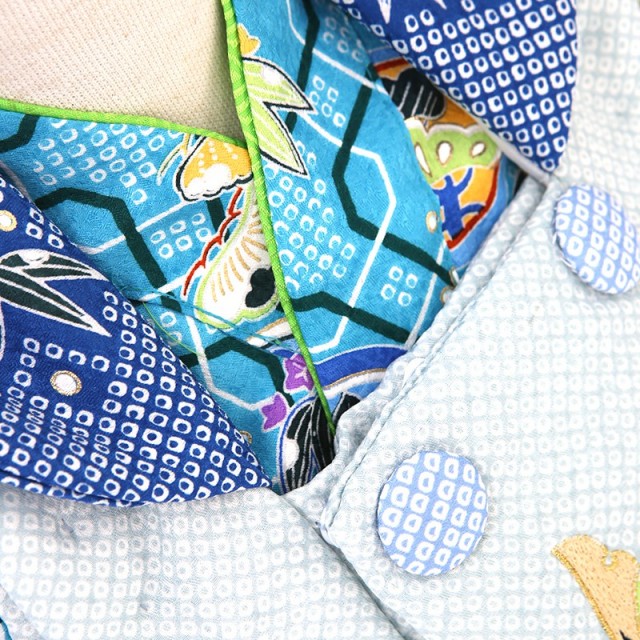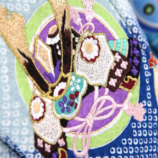 パッと華やぐ「金春色(こんぱるいろ)」は、こちらの着物のような明るく緑みの鮮やかな青色のことです。ターコイズブルーのような明るい青が、おめでたい大切な一日に華を添えてくれます。全体に華やかに描かれる「松竹梅」こちらは古くから大変親しまれた代表する吉祥文様。厳しい冬でも緑を絶やさない「松」、雪に負けず青々とまっすぐに高く伸びる「竹」、冬が終わるといち早く花を咲かせる「梅」、不老不死や長寿、そして人生おいて辛く厳しい状況でも負けずに乗り越えてほしいという願いが込められています。優しい雰囲気の「丸紋」は、角がなく優しい可愛らしい印象。丸い円は始まりも終わりもないことから、永遠、無限を意味し、円は「縁」を連想され、門出のお祝いなどおめでたいシーンにぴったりの文様です。被布の中央に大きく描かれる「兜」こちらは男の子の晴れ着に使用される文様で、立派で凛々しい姿が非常に存在感があります。大切な頭を守る道具とされ、災いから守る意味が込められています。そして格が高い武士が着用したことから、大成、出世の願いも込められる、男の子らしい伝統文様です。華やかな「絞り」が更に豪華で古典的印象を与えます。明るい色彩で、おめでたい吉祥文様ばかり。可愛らしさ古典さを楽しんでいただきたいです。