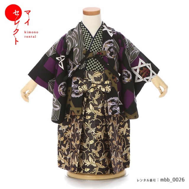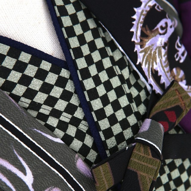 個性的でおしゃれな羽織袴です。羽織にはかっこいい「龍」が描かれ、中国古来の神仙思想に由来する想像上の動物で、服飾品にもよく使用されました。日本では、万能力を意味する文様として受け継がれています。袴にはこちらも想像上の動物「鳳凰」が描かれ、現れると世の中が繁栄すると言われ、慶事のシンボルとされました。また鳳凰は、羽をもつ動物の中で長であるとされていて、リーダーシップが取れるようにという願いも込められています。伝説の動物は男の子は憧れる存在ではないでしょうか。どのような意味が込められているか説明をしてあげると、おめでたい日が子どもにとっても忘れられない想い出になるでしょう。またチェック柄のような「市松文様」はシンプルなデザインですが、よく目にする古くから親しまれる文様です。碁盤の目のように四角形の柄が続いて途切れないことから、永遠、発展、繁栄の意味が込められます。白黒の色彩のコントラストが美しくモダンな印象を与えます。文様は伝統的な縁起のよいものばかりですが、シックな色と文様の描き方が非常におしゃれで粋な装いが出来ます。クールでかっこいいデザインを好まれる方におすすめしたい一着です。