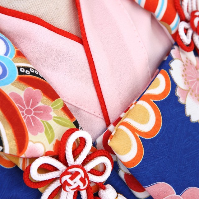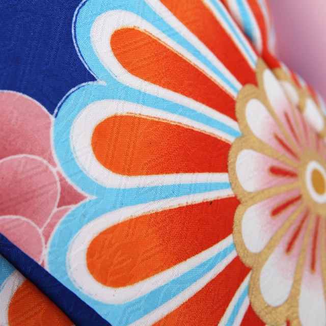 着物はシンプルにピンク一色。上に文様を描くと勿体無いくらい可愛い色味で「桜色」と呼ばれます。春を感じさせる桜の花びらのような色は、女の子らしく可憐なイメージを与えます。そして重ねる被布は「群青色」と呼ばれる深い青色でこちらも伝統色です。群青色を出すには、鉱物の瑠璃が必要でした。瑠璃は宝石としても高価だった為、非常に上品で高級感のある色味に仕上がっています。文様は、縁起がいい豪華な花々が大きく描かれます。「菊」は放射線上に咲く花から、太陽を連想させ最も位の高い花とされました。皇室の家紋にも使われているので上品で高貴さを表します。また炎症を抑える作用があり、健やかな成長を願うお守りの役割もあります。「桜楓」は、春の桜と秋の楓が一緒に描かれており、季節の違う美しいものを合わせることで、更に美しさが増すという意味を持つ文様です。日本人の美意識が象徴されたような縁起のいい文様です。伝統色の由来や、文様の意味を知ると、お祝いの日が更に特別な一日になるでしょう。可愛らしい着物に豪華な被布を重ねて、非常に華やぐ装いが完成しました。