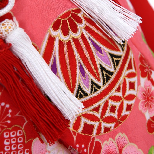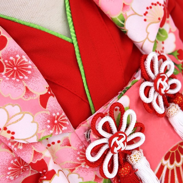 鮮やかな「赤色」はイチゴを熟したようなはっきりした色で、目を惹きつける華やかさ。赤色には厄除けの意味がある色で、古くより女の子の正装に使用されます。正統派なきちんと感を好まれる方には、赤色の着物をおすすめします。被布は可愛い「桃色」と呼ばれる伝統色です。まさに桃の花のような鮮やかなピンク色。この溢れる可愛さは幼い子ならではの色味です。そして文様が豪華に描かれていますが、色彩が赤と濃淡のあるピンクで統一感があるので、すっきりと上品に仕上がっています。描かれるのは慶事の象徴とされる吉祥文様で、中央に大きく描かれるのは「手毬」です。躍動感があり丸っこいコロンとした形が愛らしい伝統的な文様です。平安時代に貴族の遊び道具だったことから高貴さや上品さの象徴とされています。また何事も丸く収まるように、丸く大きく成長しまうようにと、お守りのような意味も含まれています。そして可憐な花々。「牡丹」は美しさの象徴とされ、女性の晴れ着に古くから親しまれる文様で、「桜」は咲き誇る姿から豊かさや繁栄を意味し、春に咲くことから新しい門出を意味する柄です。非常に華やかな着物は、写真映えもするので大切なシーンにぴったりです。上品で幸せな文様が描かれたこちらの装いに、お祝いの想いとこれからの願いを込めてみてください。