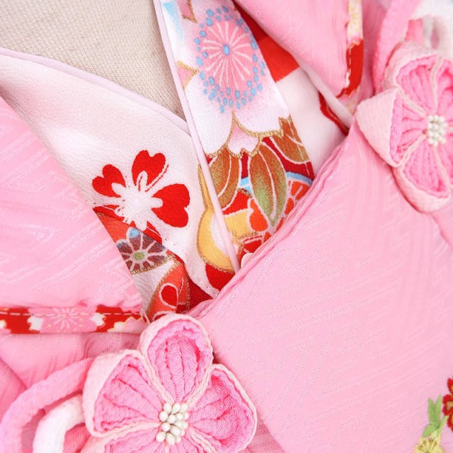 被布の色は可愛らしいピンクで、こちらは「撫子色(なでしこいろ)」という撫子の花のような少し紫がかったピンク色です。着物は鮮やかな「赤色」。そして「柑子色(こうじいろ)」といわれる密柑をやや薄くした明るいオレンジで「市松文様」が描かれます。四角形が碁盤の目のように続いていくこちらの文様は、柄が途切れることなく続くことから、繁栄の意味が込められます。そして女の子の晴れ着で古くから親しまれる「手毬」は、コロンとした見た目がとても愛らしく描かれます。平安時代の貴族の遊びだったことから高貴さを表し、また丸い形状から何事も丸く収まるように、丸く健やかに育ちますようにという願いも込められています。そして縁起のいい花々が華やかに描かれ、「桜」は咲き誇る姿から?栄や豊かさを表し、「梅」は厳しい冬が終わると、いち早く美しい花を咲かせる姿から忍耐力や長寿を意味します。また花びらをねじった「ねじり梅」も描かれているので、更に豪華な印象を感じます。「菊」は太陽のような形をしているので、最も格が高いとされい、高貴さを表します。伝統的な着物はきちんとした印象を与えるので、正式なイベントにおすすめです。女の子らしい鮮やかで温かみがある色使いと縁起のいい吉祥文様。幼い子の晴れの日らしく可愛く着ていただけます。